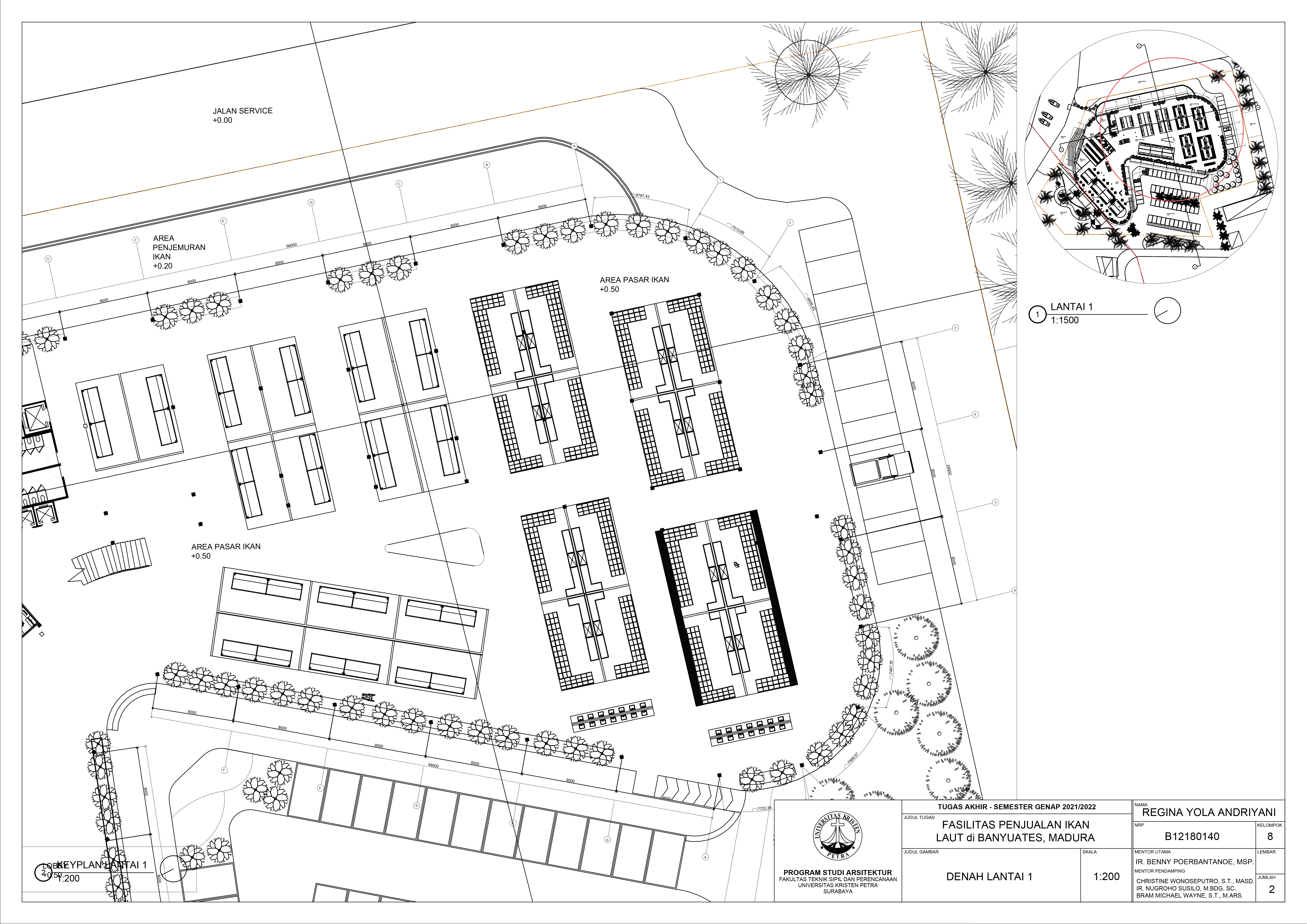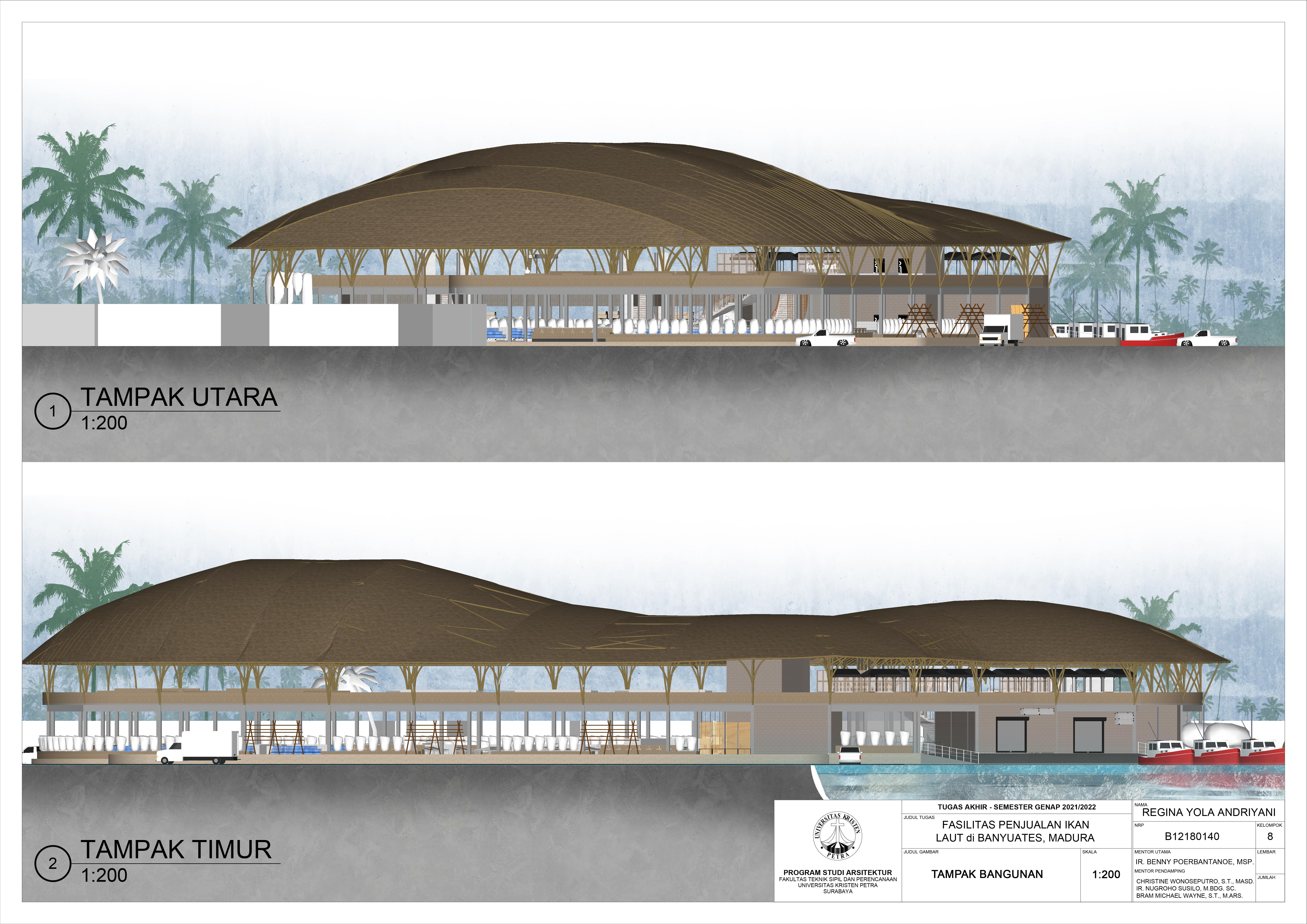 Library's collection Library's IT development CancelFasilitas Penjualan Ikan Laut di Banyuates, Madura merupakan salah satu fasilitas yang menggabungkan 2 fungsi bangunan yang cukup berbeda, dengan mengedepankan UMKM agar wisatawan lokal maupun mancanegara dapat menikmati hasil laut serta makanan khas Madura. Kurangnya penataan integrasi ruangan yang baik dan kegiatan masyarakat yang berjalan dengan cepat menyebabkan sanitasi bangunan dan pengolahan ruang didalam pasar menjadi masalah utama dalam proses perancangan ini. Ide utama dalam perancangan ini adalah penyaluran limbah dari ikan yang disalurkan melalui selokan khusus limbah untuk menghindari pencampuran zat organik pada air untuk membersihkan ikan dan air hujan. Desain fasilitas ini menyesuaikan kebutuhan pengguna untuk berbelanja ikan laut dalam pemenuhan kebutuhan sehari-hari dan sekaligus menjadi tempat wisata setempat.