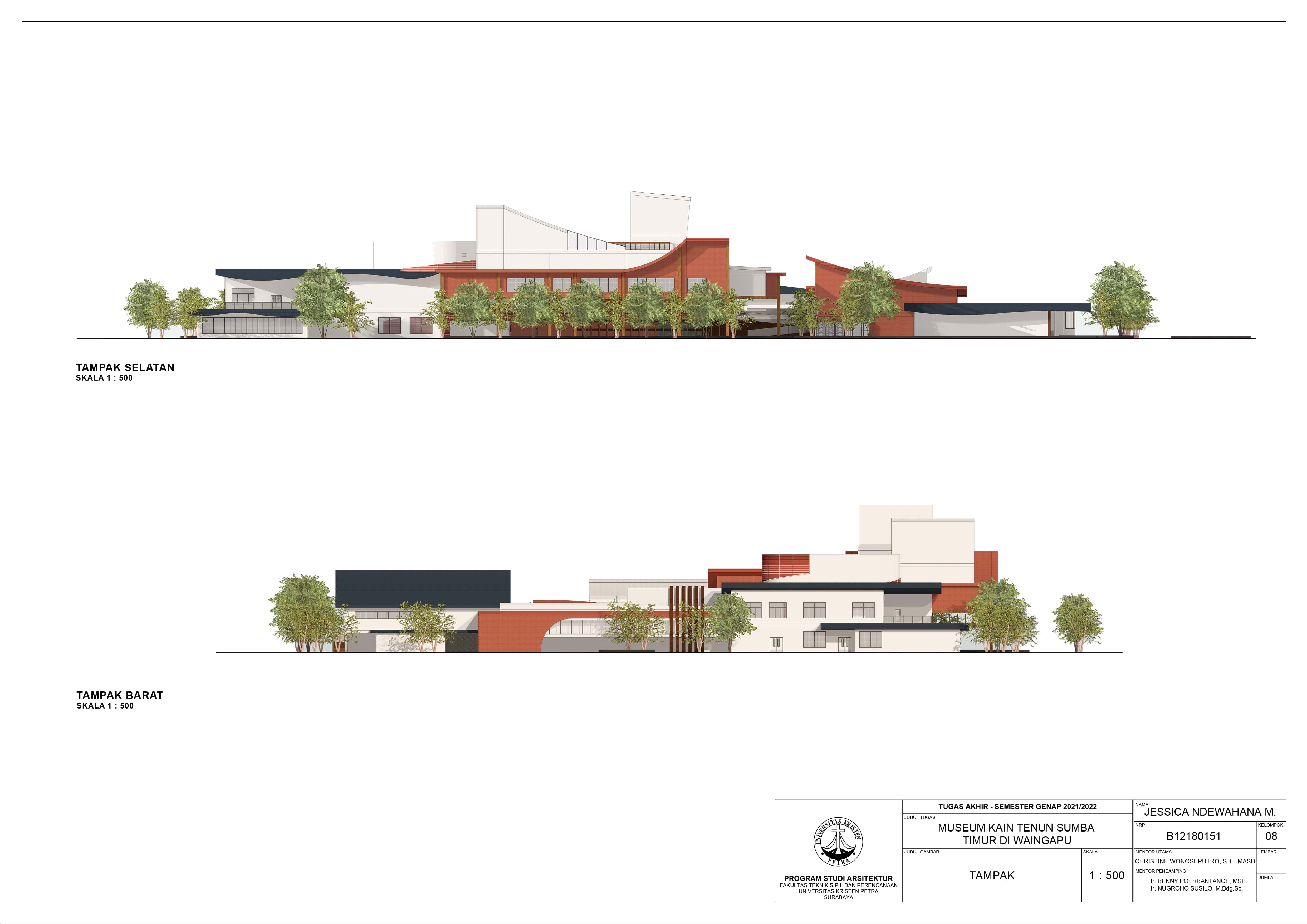 Library's collection Library's IT development CancelKain tenun Sumba adalah sebuah warisan kebudayaan yang telah turun-temurun selama ratusan tahun. Kain Tenun ini mulai mendunia dan menarik perhatian banyak orang, seiring dengan meningkatnya pariwisata Sumba karena keindahan alamnya, karena itu mulai muncul beberapa perubahan karena mengikuti alur modern (Intan, 2021). Pada Februari 2022, Kain Sumba terpilih untuk diajukan menjadi warisan budaya dunia di UNESCO, apabila terkabul maka derajat produk asal Sumba ini akan semakin bergengsi di dunia Internasional (Taolin, 2022). Meskipun begitu, terdapat banyak orang yang masih tidak mengenalnya dan/atau tidak bisa membedakan dengan kain nusantara lainnya. Sedangkan kebutuhan pariwisata Sumba Timur akan terus naik, karena itu fasilitas museum menjadi sebuah sarana untuk mengkomunikasikan kesenian kain tenun sumba timur yang juga perlu bisa menarik pengunjung, mempreservasi dan mengedukasi tentang kain sumba dan filosofi yang terkandung didalamnya. Maka dari itu digunakan pendekatan simbolik yang dibagi menjadi 3 tahap kehidupan yaitu; kelahiran, kehidupan, dan kematian. Hal ini bertujuan untuk menunjukkan nilai dan peran kain tenun dalam tiap tahap kehidupan orang Sumba Timur. Desain juga mengadopsi nilai filosofi arsitektur rumah adat dari Sumba Timur untuk bisa menunjukkan dan menyimbolkan suasana dan nilai kebudayaan dari Sumba Timur itu sendiri. Pendalaman pada desain fasad digunakan untuk menonjolkan motif dan makna simbolik per massa pameran sehingga bisa dirasakan lebih jelas. Keseluruhan bangunan menggunakan warna-warna yang berasal dari komposisi warna kain tenun Sumba Timur yaitu merah, biru, cokelat, putih, hitam – dengan warna merah dan biru yang dominan yang merepresentasikan warna paling khas dari kain Sumba Timur.