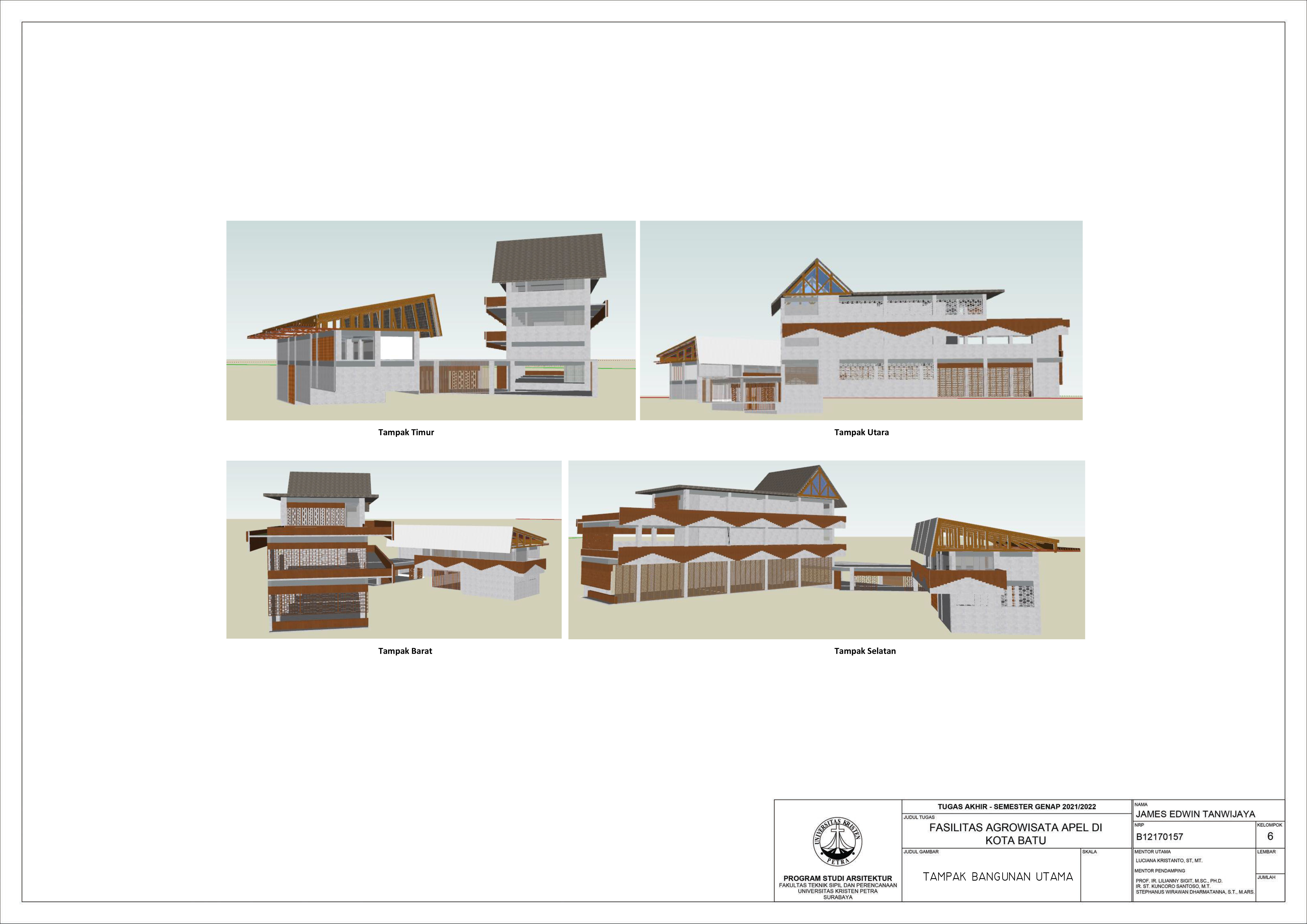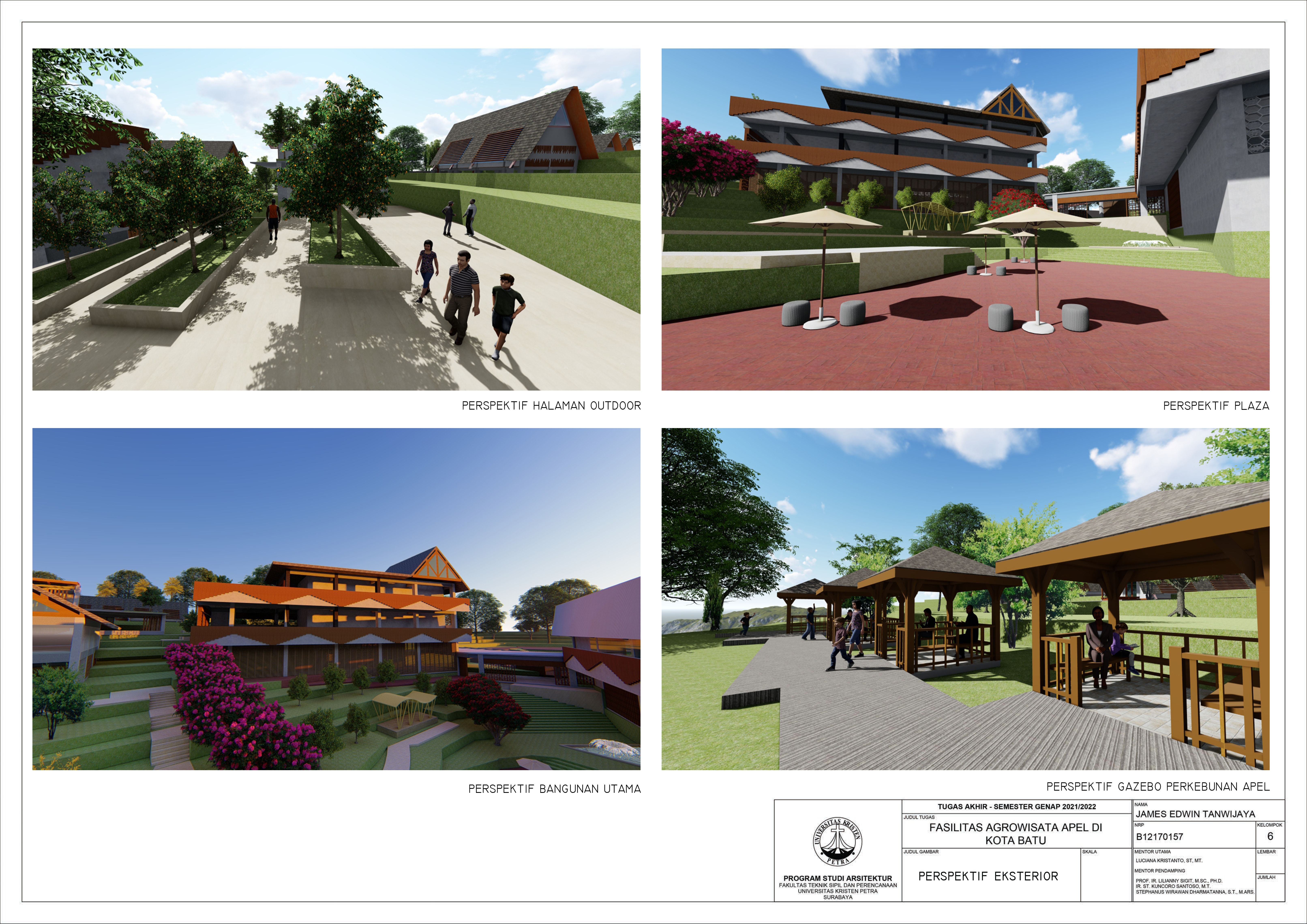 Library's collection Library's IT development CancelFasilitas Agrowisata Apel di Kota Batu ini dilatarbelakangi dengan kecenderungan masyarakat dalam meminati wisata berupa taman hiburan berupa permainan daripada wisata alam seperti agrowisata yang menyebabkan rendahnya kemajuan wisata alam yang ada di Kota Batu. Oleh karena itu, dengan hadirnya agrowisata apel ini diharapkan mampu menampilkan sisi agrowisata yang memberikan kenyamanan dan ikatan dengan alam sekitar. Agrowisata ini memperkenalkan hubungan antara alam dengan bangunan sehingga manusia yang berada di dalamnya menjadi aman dan nyaman melalui pendekatan biophilic dengan pendalaman karakter ruang. Dilengkapi dengan fasilitas publik antara lain: ruang pameran, restoran, cafétaria, ruang produksi keripik apel, pusat oleh-oleh dan fasilitas penginapan. Proyek ini juga diharapkan dapat mengedukasi masyarakat betapa pentingnya alam sekitar.