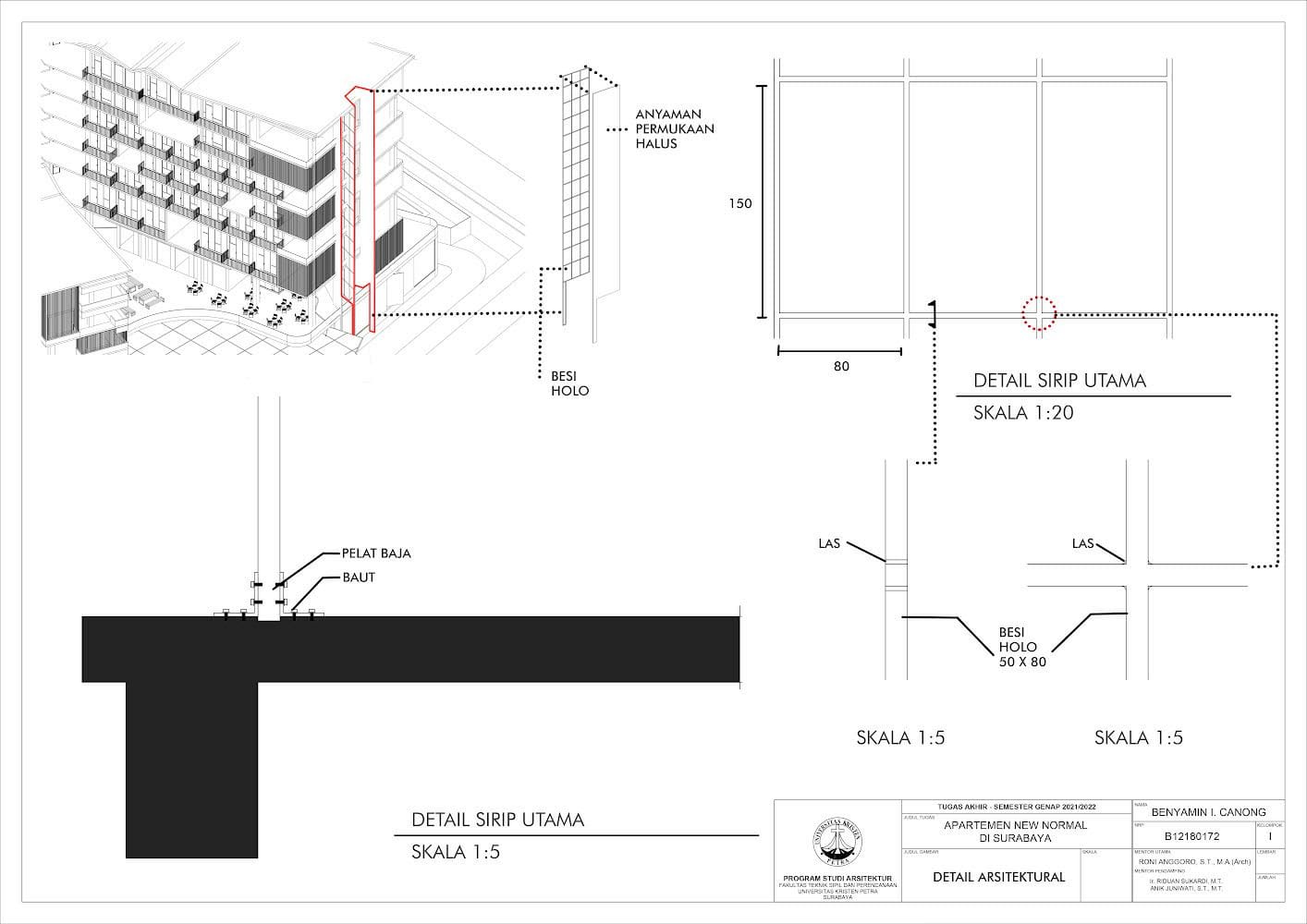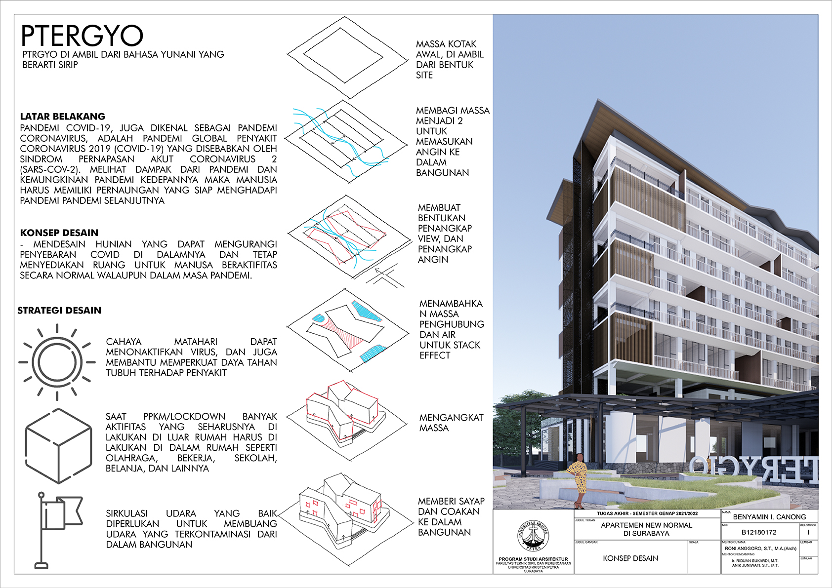 Library's collection Library's IT development CancelApartemen New-Normal di Surabaya merupakan apartemen yang didesain agar memiliki sistem yang dapat menghadapi pandemi, agar apartemen dapat mengurangi dan bahkan menghentikan transmisi pandemi yang terjadi dalam bangunan. Selain dapat menghentikan transmisi pandemi Apartemen juga dapat memfasilitasi kegiatan sehari hari penghuninya jika penghuninya tidak diperbolehkan untuk keluar dari apartemennya. Desain sangat mempertimbangkan 3 aspek yaitu penghawaan, pencahayaan, dan tata ruang sehingga dipilih metode pendekatan sistem dan pendalaman sains arsitektur dan tata ruang.