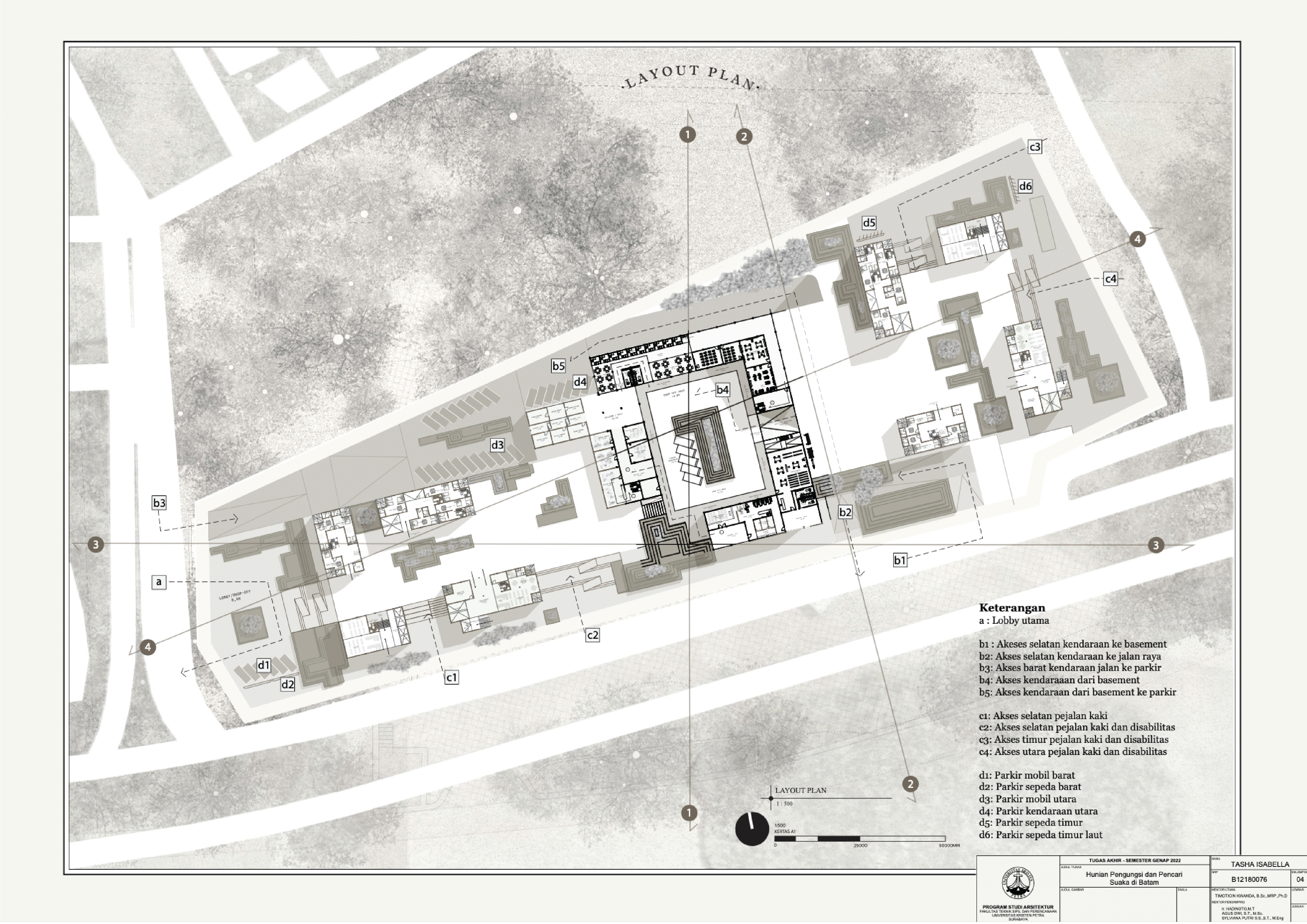 Library's collection Library's IT development CancelFasilitas hunian pengungsi dan pencari suaka merupakan rumah yang memiliki program kegiatan bagi pengungsi dan pencari suaka yang ada di Indonesia. Hunian ini terdiri dari sembilan bangunan yang merupakan 1 bangunan utama dan 8 bangunan pendukung, dengan 2 akses masuk kendaraan, 2 akses parkir, 4 akses pejalan kaki yang terjabar pada dua kluster. Fasilitas ini juga didukung akses masuk disabilitas, taman komunal serta area berjualan indoor maupun outdoor. Program ruangnya dibagi menjadi 4 target pengunjung, yaitu petugas, pengungsi, pencari suaka dan pendatang. Masing-masing kategori memiliki akses yang mudah dipahami serta program kegiatan yang tersusun dengan baik. Fasilitas ini juga memiliki keamanan yang tinggi untuk target pengunjung pencari suaka. Dengan pengawasan dan juga akses terbatas, perumahan pencari suaka memiliki tingkat keberhasilan yang baik.