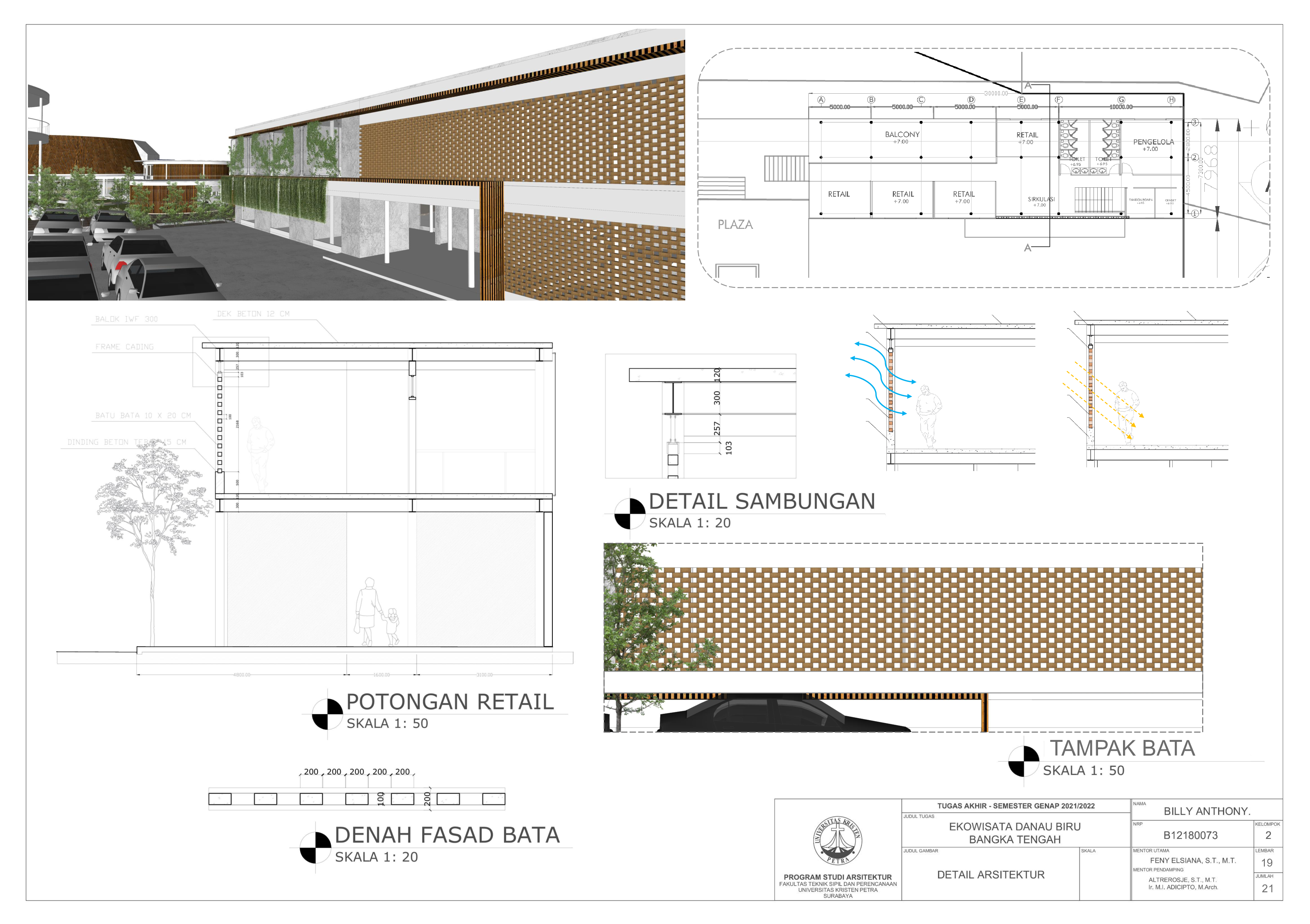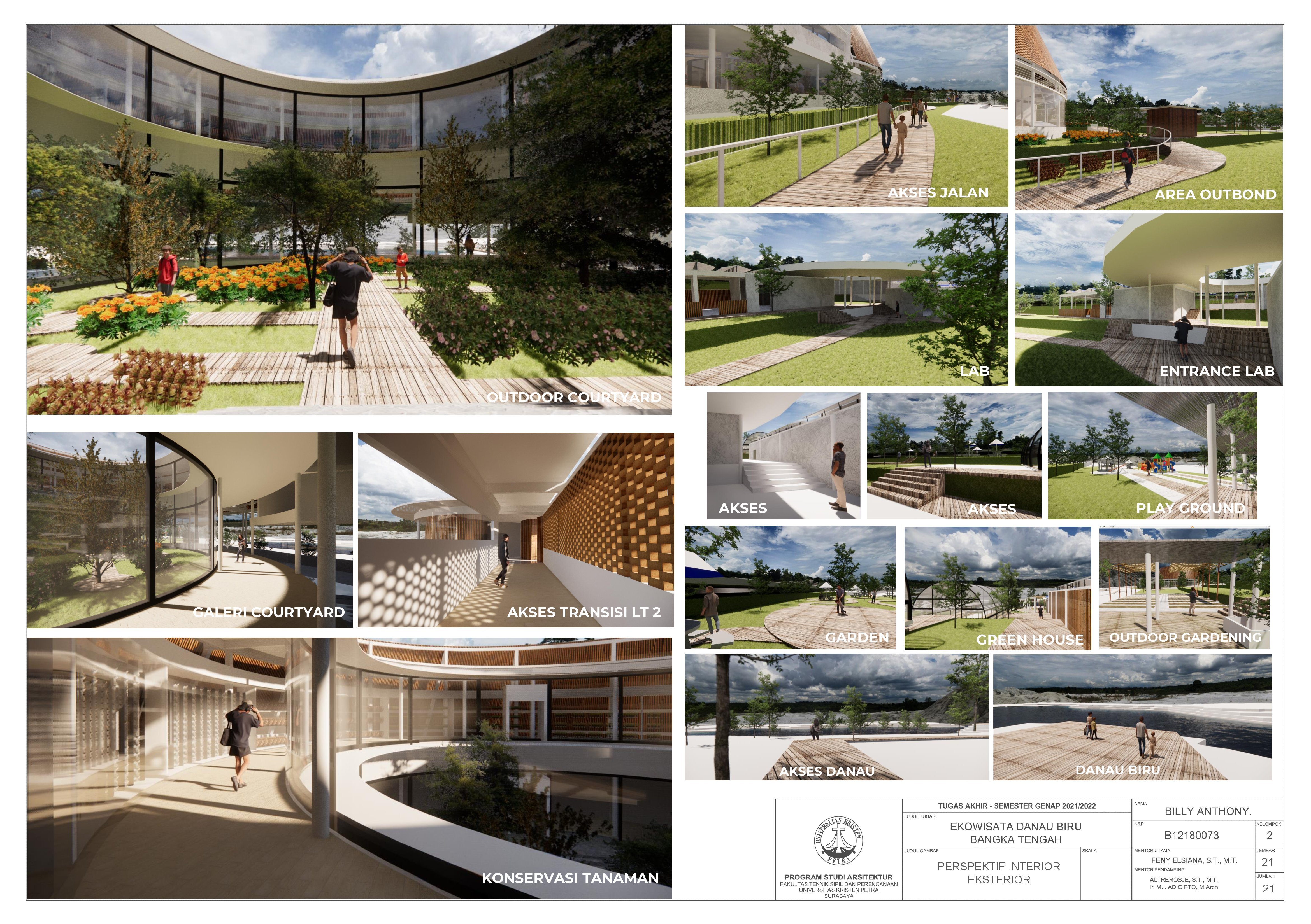 Library's collection Library's IT development CancelPerancangan Ekowista danau biru Bangka tengah dilatar belakangi oleh banyaknya hutan yang rusak akibatnya pemanasan global meningkat, selain itu rusaknya hutan tersebut dikarenakan aktifitas manusia seperti pertambangan. Untuk menjaga kestabilan hutan maka desain ditujukan untuk tujuan Reklamasi konservasi alam dan menjaga stabilitasnya. Fasilitas ini akan berdiri di atas bekas area tambang di sebrang danau Kaolin Bangka Tengah, Jalan raya Nimbung kabupaten Bangka Tengah. Perancangan ini diharapkan untuk bisa menjadi tempat yang hijau seperti sedia kala dan menjadi pembelajaran yang tidak hanya digunakan pengelola tapi juga dari pengunjung untuk ikut belajar memelihara lingkungan alam. Untuk menunjang upaya mewadahi aktivitas reklamasi yang memelihara stabilitas flora, pendekatan lingkungan di gunakan sebagai penyelesaian masalah desain. Penyelesaian dari pendekatan tersebut adalah menciptakan bangunan yang dapat menunjang kegiatan reklamasi dan konservasi sekaligus menjadi wadah pembelajaran bagi pengunjung yang datang ke fasilitas tersebut. Selain itu salah satu dampak yang diharapkan bisa dirasakan oleh pengguna adalah bagaimana sebuah Kawasan hijau dapat menurunkan dampak pemanasan global secara kenyamanan suhu, sehingga dari sana pendalaman penghawaan alami digunakan sebagai bentuk penyelesaian dari permasalahan kenyamanan pengguna.