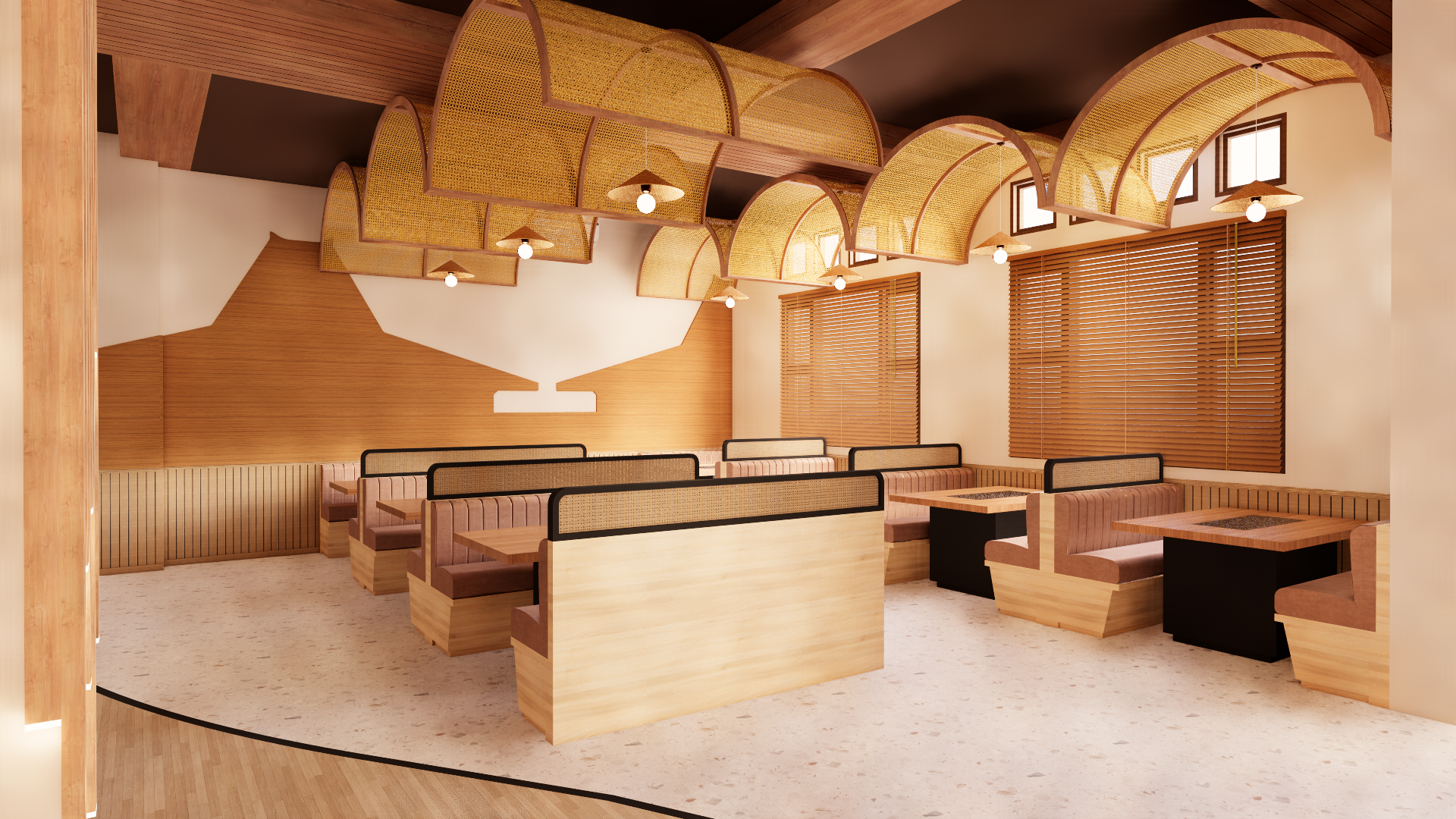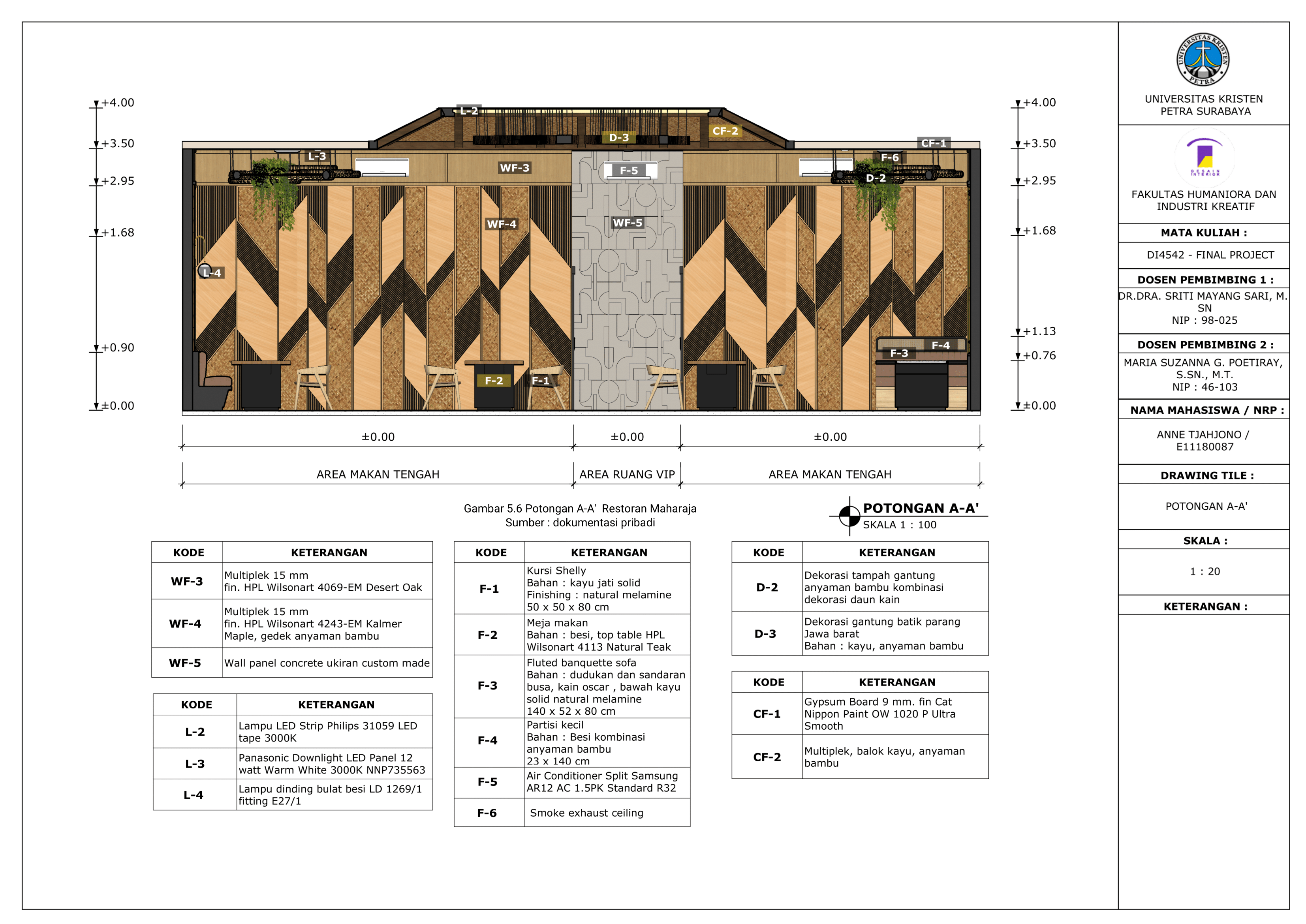 Library's collection Library's IT development CancelRestoran barbeque merupakan salah satu restoran yang sedang tren di masyarakat Surabaya. Beberapa restoran barbeque mengaplikasikan desain untuk memberikan tampilan menarik, namun kurang memperhatikan dalam penggunaan material. Jenis material yang digunakan memiliki kandungan zat kimia sehingga dapat berbahaya bagi kesehatan. Penerapan material ramah lingkungan dapat dijadikan salah satu alternatif baru dalam perancangan interior restoran barbeque. Material ramah lingkungan sendiri memiliki dampak baik bagi lingkungan dan kesehatan. Restoran Maharaja merupakan restoran barbeque yang menggunakan material ramah lingkungan pada aplikasi desainnya. Permasalahan yang didapatkan pada perancangan ini bagaimana menerapkan material ramah lingkungan pada perancangan Restoran Barbeque Maharaja di Surabaya dan bagaimana menciptakan suasana dengan penggunaan material ramah lingkungan pada perancangan Restoran Barbeque Maharaja di Surabaya. Tujuan perancangan ini menciptakan sebuah perancangan interior restoran barbeque dengan menerapkan material ramah lingkungan, dan gaya modern etnik budaya Jawa. Dalam melakukan perancangan menggunakan metode design thinking yang terdiri dari 9 tahapan yaitu Understand, Observe, Point Of View, Ideate, Prototype, Test, Story Telling, Pilot, Business Model. Hasil perancangan ini berupa sebuah perancangan interior dengan penerapan material ramah lingkungan seperti olahan bambu, limbah kayu sisa usaha furniture, cat waterbased, HPL dan gaya desain modern etnik budaya Jawa. Memberikan hasil dan solusi desain baru untuk menciptakan suasana baru yang berbeda dari restoran barbeque pada umumnya.