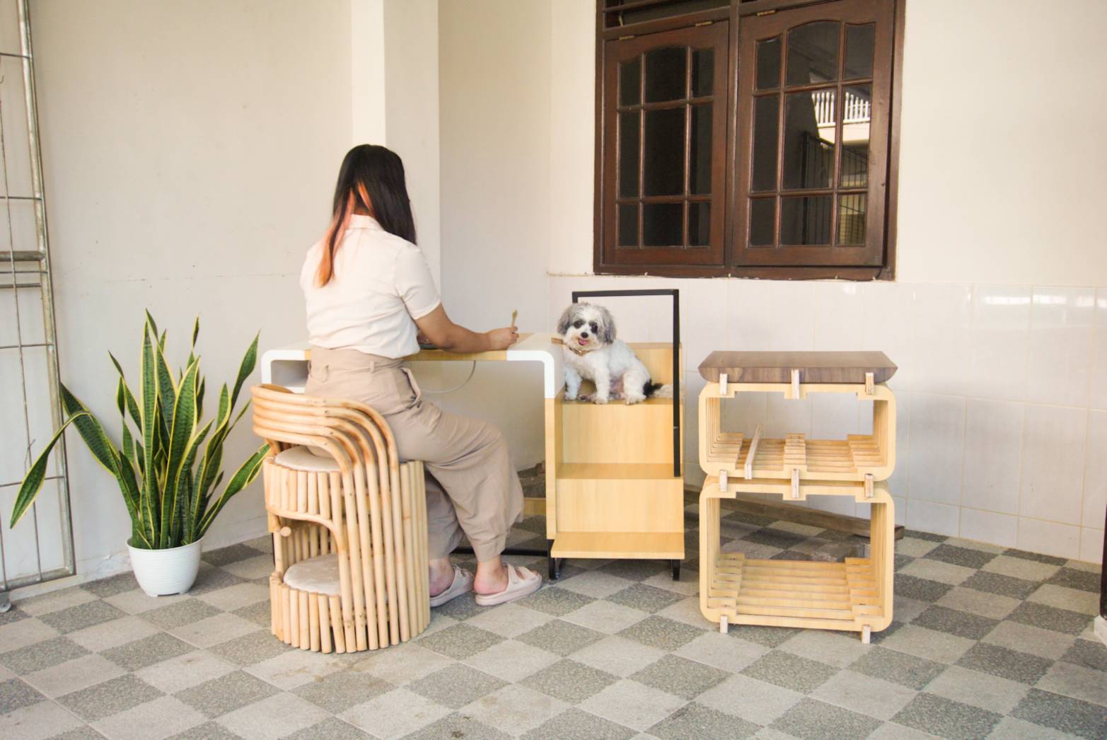 Library's collection Library's IT development CancelManusia adalah spesies sosial yang bergantung pada interaksi sosial untuk bertahan hidup dan berkembang. Pandemi COVID-19 menghambat proses ini. Ketika kebutuhan tersebut tidak dapat terpenuhi, manusia akan menggunakan sumber lain sebagai pemberi input sosial, salah satunya adalah melalui pemeliharaan hewan peliharaan. Pandemi COVID-19 merupakan faktor terbesar dalam adopsi hewan peliharaan pada tahun 2020 (Morgan L, et al. 155). Hal ini disebabkan oleh meningkatnya perasaaan kesepian akibat pembatasan kegiatan (Social Distancing). Pandemi COVID-19 menjadi faktor terbesar dalam meningkatnya kegiatan Work From Home di seluruh dunia. Design Interior merupakan bidang ilmu yang mengutamakan hubungan manusia dalam ruang yang merupakan faktor penting dalam membuat desain ruang. Dalam bekerja, kenyamanan merupakan hal terpenting untuk mendukung produktivitas terutama ketika bekerja dari rumah. Hal ini menjadi hal yang penting untuk diketahui karena menjadi faktor yang penting dalam menentukan kebutuhan pekerja work form home untuk menjamin kenyamanan dan mendorong produktivitas kerja. Perancangan ini menggunakan metode menggunakan metode Design Thinking guna mendapatkan perancangan yang paling sesuai dengan kebutuhan pengguna. Hasil perancangan ini adalah satu set produk yang dapat memberikan keuntungan untuk pengguna dan hewan peliharaan mereka masing-masing.