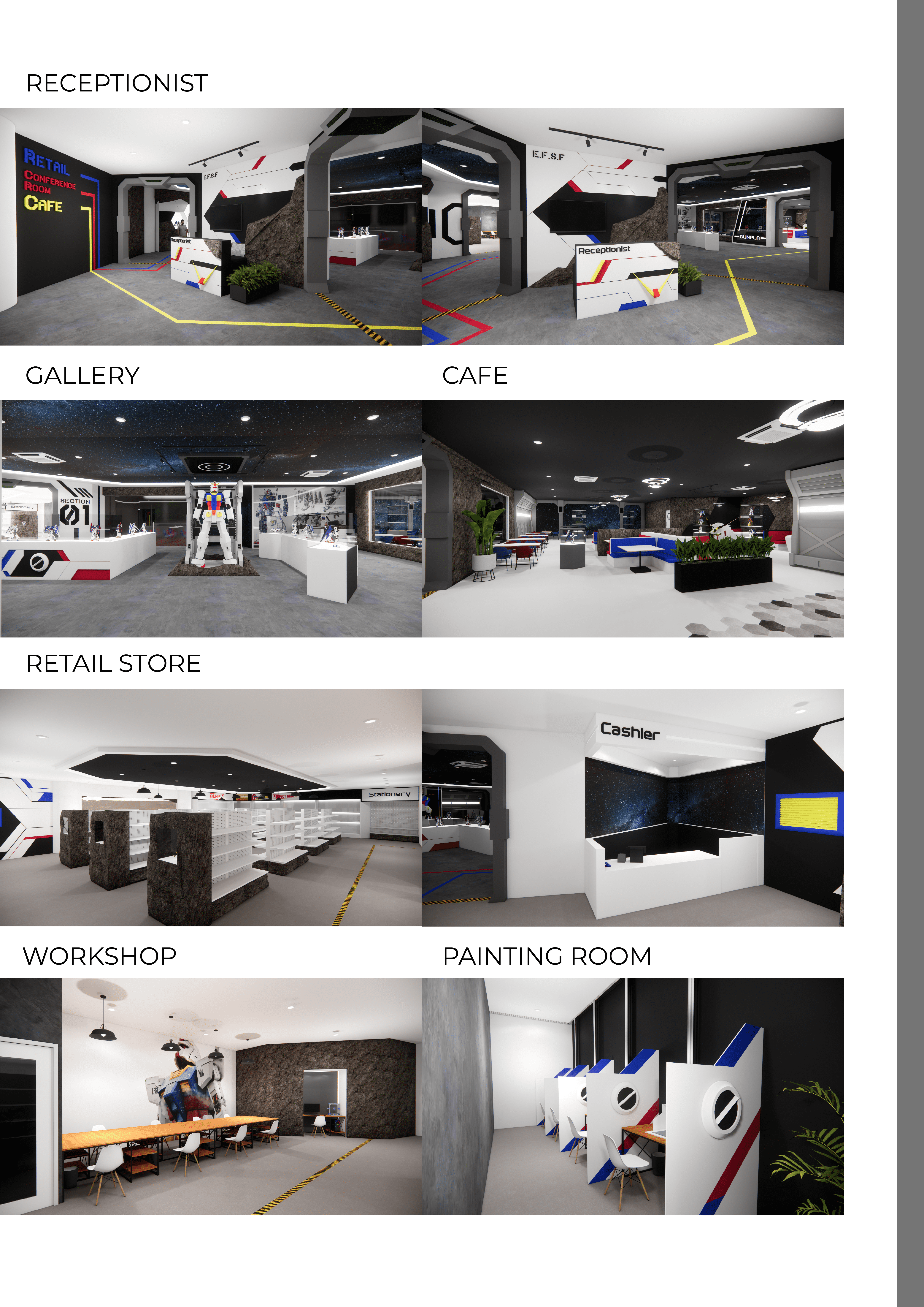 Library's collection Library's IT development CancelGundam Center Surabaya merupakan tempat melakukan aktivitas berkumpul, menjawab kebutuhan dan tempat jual beli bagi para pencinta dan perakit Gundam Plastic Model di Surabaya untuk mendukung aktivitas komunitas Gundam di Surabaya. Metode yang digunakan dalam perancangan kali ini adalah metode Design Thinking yaitu mewawancarai sebuah komunitas, menciptakan konsep yang menjawab permasalahan sebuah komunitas dan menerapkannya dengan menggunakan aplikasi 3D. Perancangan Gundam Center ini menggunakan konsep pasca perang di anime Gundam dan bergaya futuristic modern seperti pada anime Gundam dan juga menggunakan teknologi terbaru pada interiornya. Interior dari Gundam Center bertujuan untuk menyediakan ruang dan fasilitas bagi para komunitas Gundam di Surabaya, meningkatkan imajinasi para perakit Gundam Plastic Model yang interiornya mengimplementasikan setiap elemen dari interiornya dari anime Mobile Suit Gundam.