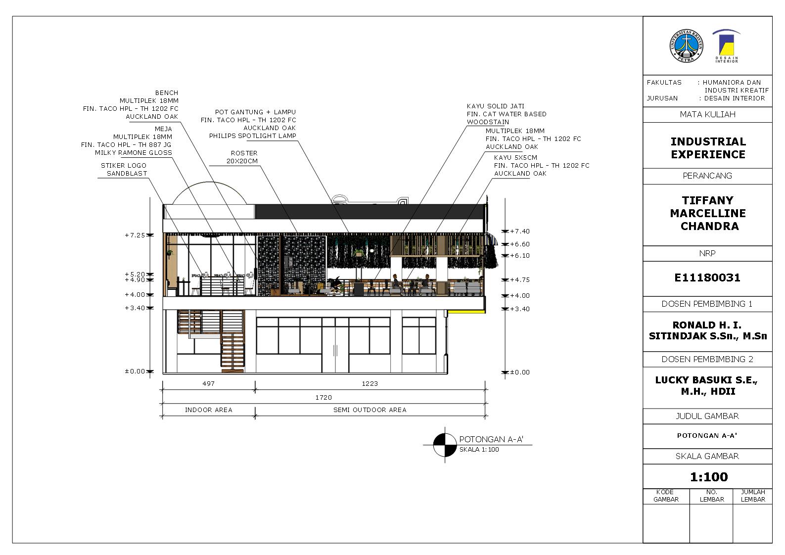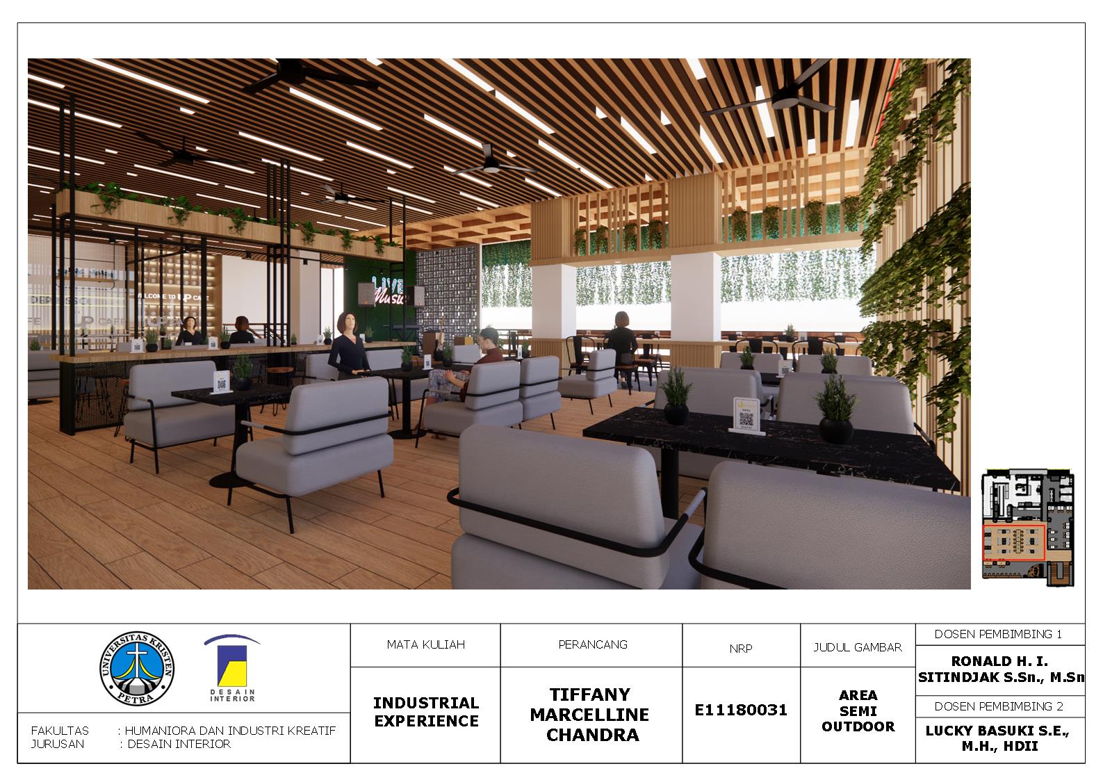 Library's collection Library's IT development CancelBisnis cafe kini semakin merebak, khususnya di kota-kota besar seperti Surabaya. Salah satu penyebabnya adalah generasi masa kini yang gemar nongkrong di cafe. Saat ini, banyak orang datang ke cafe tidak hanya untuk menikmati hidangannya saja, tetapi juga untuk menghilangkan rasa bosan atau mencari suasana baru dengan bertemu dan berbincang bersama teman, rekan, keluarga, dan lain-lain. Pada perancangan cafe “Up Café” yang berlokasi di Surabaya ini, terdapat permasalahan terkait bagaimana merancang interior cafe “Up Café” dengan tampilan yang diinginkan klien atau owner, yaitu simple and clean, dan bagaimana mengakomodasi kebutuhan klien atau owner. Metode yang digunakan adalah metode design thinking yang terbagi menjadi 9 tahapan yaitu understand, observe, point of view, ideate, prototype, test, story telling, pilot, business model. Dengan menghadirkan konsep “meet up” yang merupakan akronim dari modern, clean, catchy, natural, pleasant diharapkan cafe “Up Cafe” bisa menjadi tempat yang nyaman bagi pengunjung untuk berkumpul atau nongkrong, sekaligus dapat mengatasi permasalahan ruang, dan sesuai dengan keinginan klien atau owner.