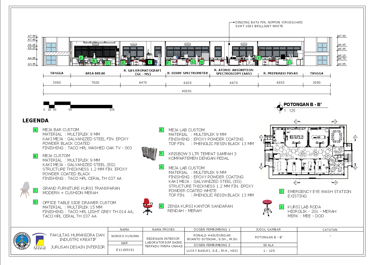 Library's collection Library's IT development CancelLaboratorium Science Building merupakan salah satu bagian dari Gedung Science Building yang difungsikan sebagai tempat untuk melakukan kegiatan praktik penelitian. Laboratorium sendiri mulai digunakan sejak tahun 2014. Meskipun usia pemakaian yang terbilang masih muda, telah didapati ragam permasalahan dalam interior tata ruangnya seperti kerusakan di beberapa area, efisiensi penataan tata ruang yang kurang optimal dan penerapan New Normal yang masih tergolong minim. Perancangan ini akan dilaksanakan dengan menggunakan metode Design Thinking yang terdiri atas berbagai tahapan, yaitu: Inspiration (Understand, Observe, Point Of View), Ideation (Ideate), dan Implementation (Prototype, Test). Perancangan ini menargetkan interior ruang dengan tata ruang yang lebih efisien dan efektif, sekaligus juga interior yang terintegrasi dengan budaya New Normal sehingga diharapkan ruang yang dapat mengakomodasi sekaligus melindungi penggunannya dapat tercapai.