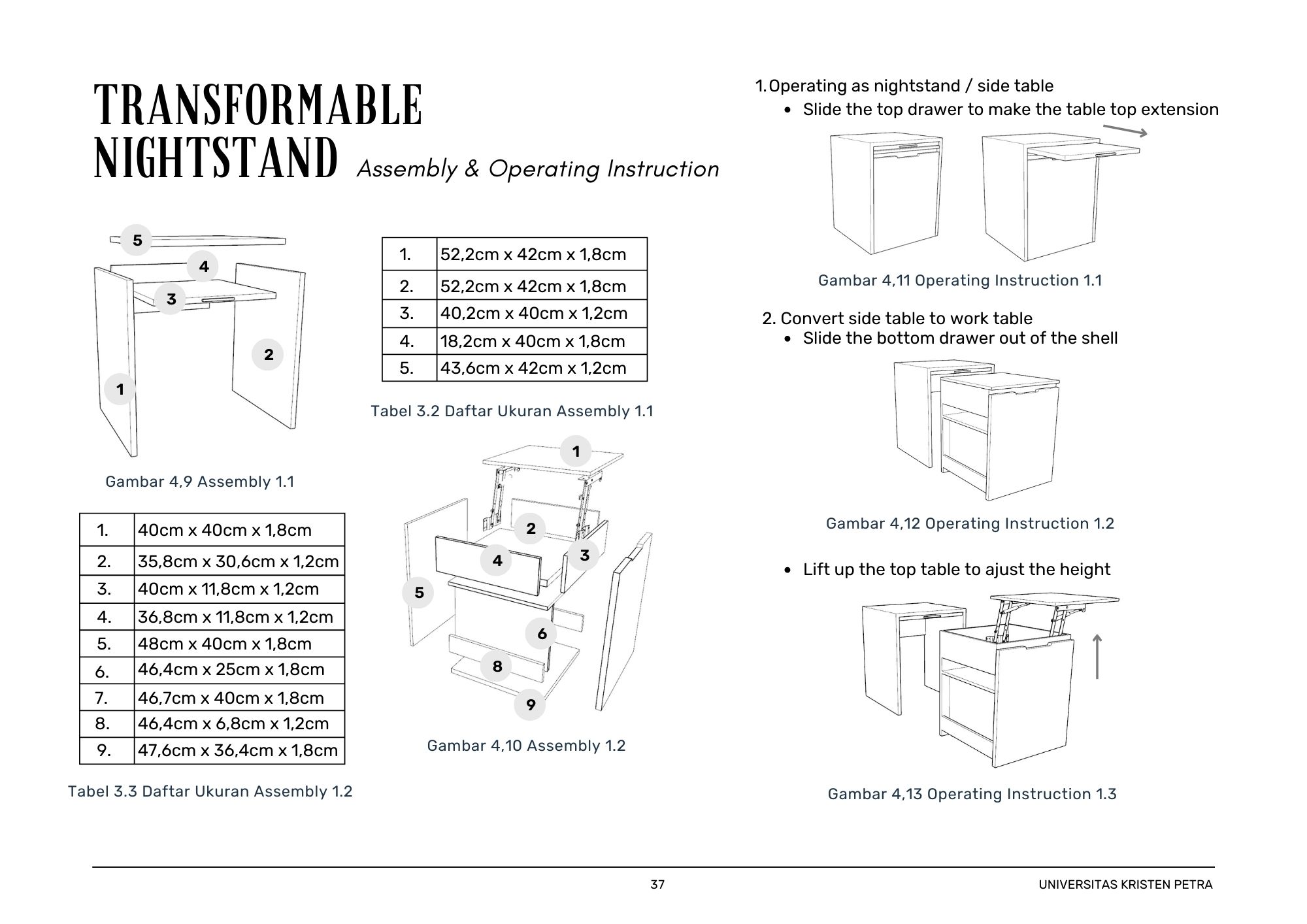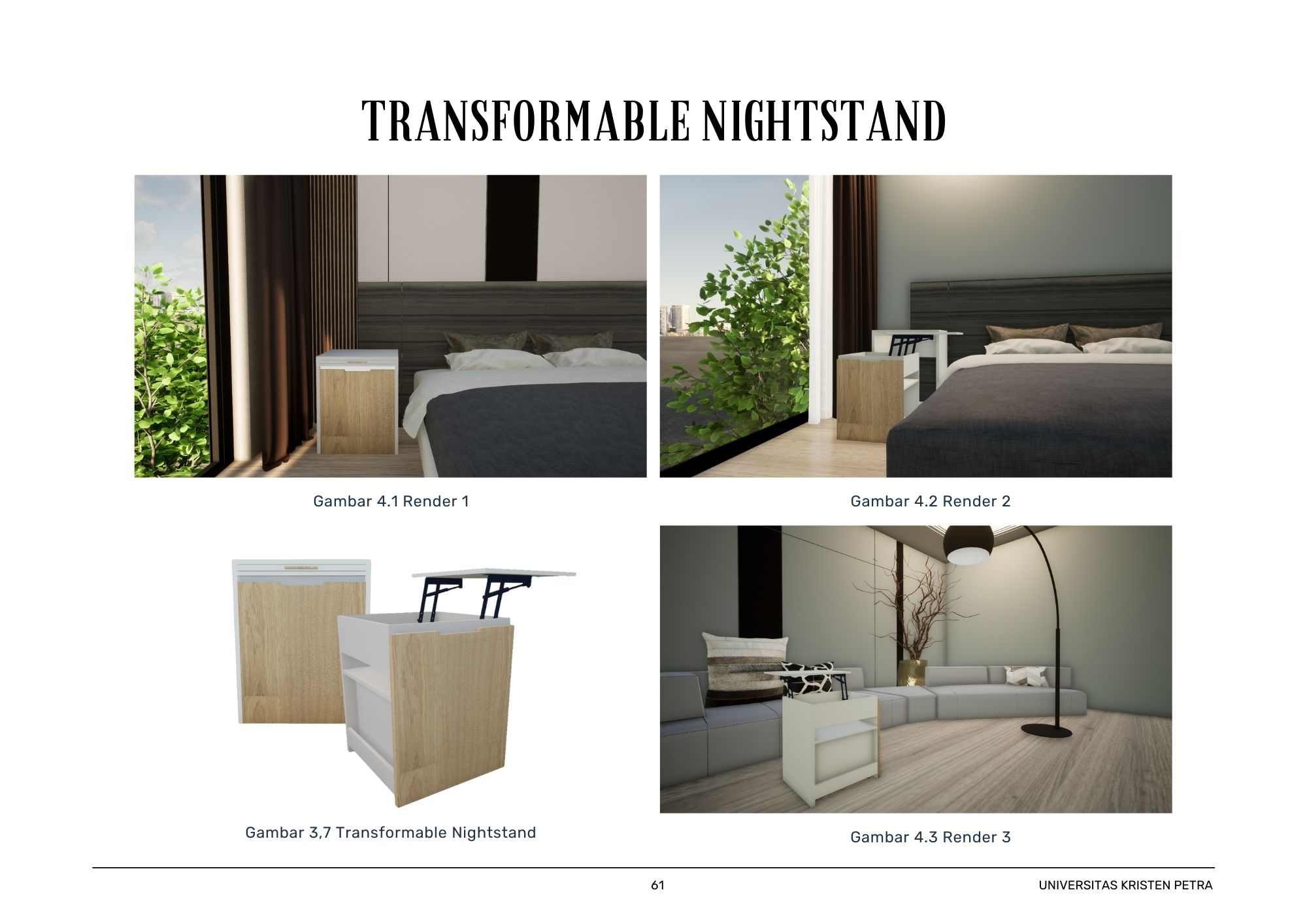 Library's collection Library's IT development CancelKebutuhan akan tempat tinggal yang terus meningkat mendorong penduduk kota untuk tinggal di hunian dengan lahan terbatas seperti apartment, perumahan kecil, maupun indekos karena harganya terjangkau serta letaknya yang strategis. Namun hunian dengan lahan yang terbatas memiliki berbagai permasalahan tersendiri seperti menghambat aktivitas, sirkulasi gerak yang tidak nyaman, dan kurangnya area untuk perabot yang dibutuhkan. Kejadian tersebut memunculkan peluang untuk melakukan inovasi startup transformable table untuk memenuhi kebutuhan tersebut. Transformable table adalah meja yang dapat berubah bentuk dan fungsi sehingga mampu memaksimalkan fungsi ruang. Projek ini dilakukan berdasarkan analisa dan survey terhadap kebutuhan akan perabot penduduk kota dengan rentan usia 18-50 tahun yang tinggal di hunian dengan lahan terbatas, serta menggunakan 9 metode desain thinking yaitu: Understand, Observe, Point of View, Ideate, Prototype, Test, Storytelling, Pilot, dan Business Model Canvas