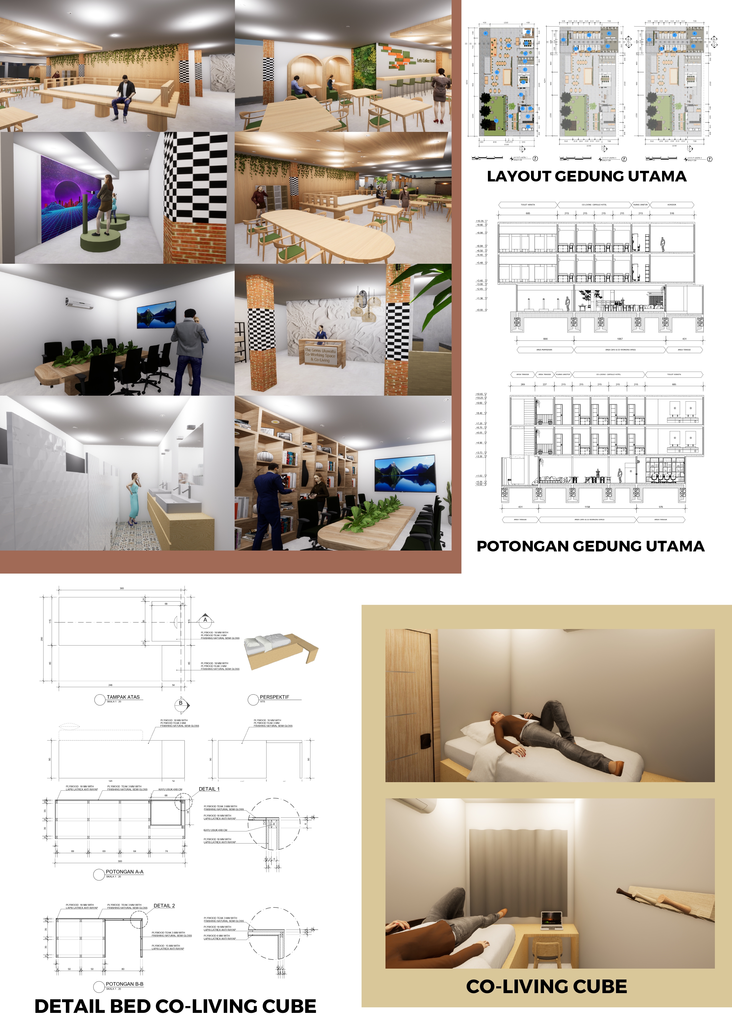 Library's collection Library's IT development CancelCo-Working Space pada dasarnya merupakan tempat kerja bersama bagi para Entrepreneurs. Karena berkembangnya zaman masa kini, teknologi komunikasi dan informasi semakin maju, keberadaan internet saat ini sangat memungkinkan untuk seseorang dalam melakukan komunikasi jarak jauh dalam berbagai cara. Tempat ini berkembang luas secara global, termasuk di Indonesia. Di Bali jumlah coworking space terus bertambah karena banyaknya Digital Nomad yang tinggal di Bali. bertujuan untuk merancang interior Co-Working Space dan Co-Living yang menghadirkan nuansa harmonisasi antara unsur lokalitas bali dengan gaya modern dengan pendekatan Biophilic Design. Perancangan ini dilakukan sebagai upaya pengembangan desain Co-Working Space dan Co-Living dari segi kenyamanan pengguna saat bekerja di dalamnya. Faktor-faktor yang diteliti adalah pengaturan spasial, jenis furniture, kebisingan, penghawaan yang mempengaruhi temperatur, pencahayaan, dan suasana yang dihadirkan dari tampilan visualnya. Metode yang digunakan adalah design thinking, studi tipologi objek perancangan yang serupa, studi literatur melalui internet (jurnal laporan penelitian). Hasilnya menunjukkan desain perancangan interior yang nyaman bagi para pengguna dan beberapa faktor pembentuk lingkungan kerja yang sudah diterapkan secara optimal untuk penggunanya.