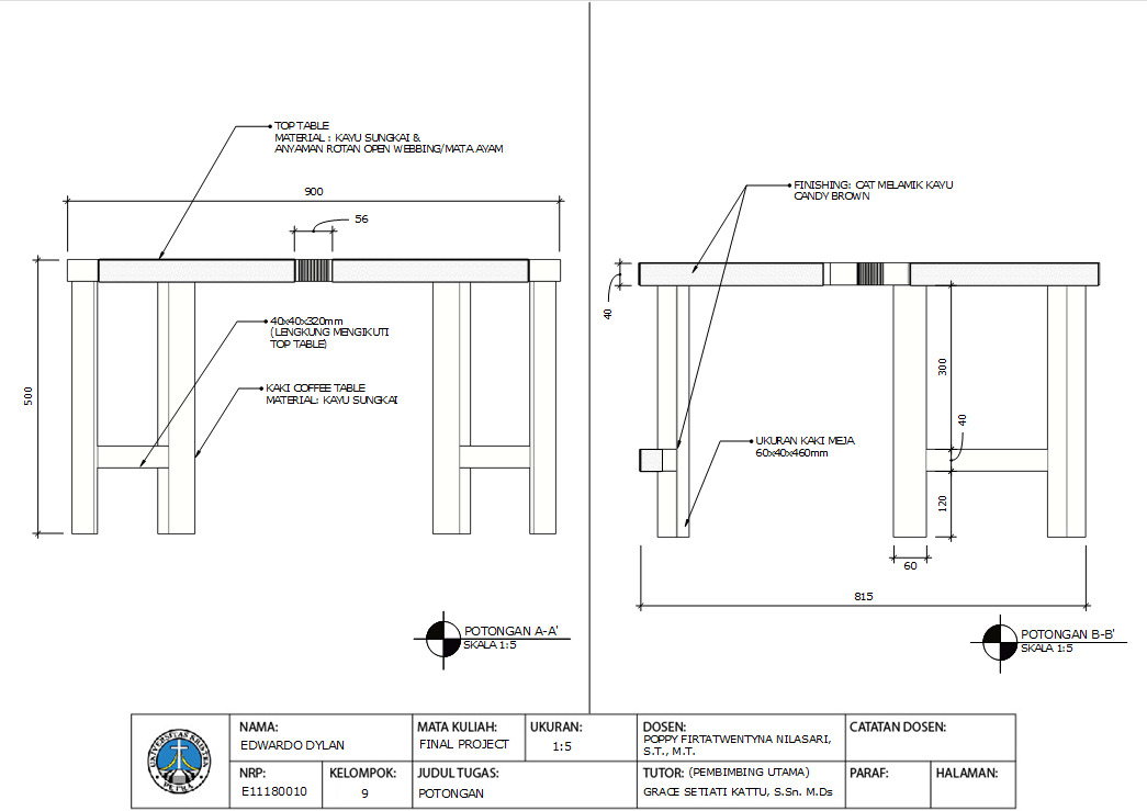 Library's collection Library's IT development CancelDesain tradisional Jawa adalah salah satu desain yang mencoba membawa nilai-nilai tradisi, unsur budaya, dan kearifan lokal suatu daerah ke dalam wujud desain suatu produk/interior ruangan. Desain tradisional Jawa memiliki beberapa karakteristik antara lain, penggunaan elemen kayu, penggunaan warna tanah yang kental, dan penggunaan unsur rotan modern. Pokok masalah yang akan dibahas yakni bagaimana merancang furniture berbasis budaya tradisional Jawa dan modern yang efisien dan dapat memenuhi kebutuhan pengguna dan apakah dengan perancangan furniture berbasis budaya tradisional Jawa dan modern dapat beradaptasi dengan interior ruangan saat ini dan juga bisa membangkitkan kembali desain tradisional di era modern ini. Metode yang digunakan adalah design thinking yang dibagi menjadi 5 tahapan: Emphatize, Define, Ideate, Prototype, dan Test. Hasil perancangan berupa satu jenis produk interior yaitu side table dengan menggunakan konstruksi knockdown dan akan dimanfaatkan di rumah tinggal, lebih tepatnya pada ruang tamu. Produk interior yang dihasilkan akan memenuhi kebutuhan pengguna mulai dari efisiensi produk (harga, kemudahan penggunaan, packaging), efisiensi ruang dan juga dapat beradaptasi dengan interior ruangan milenial/modern.