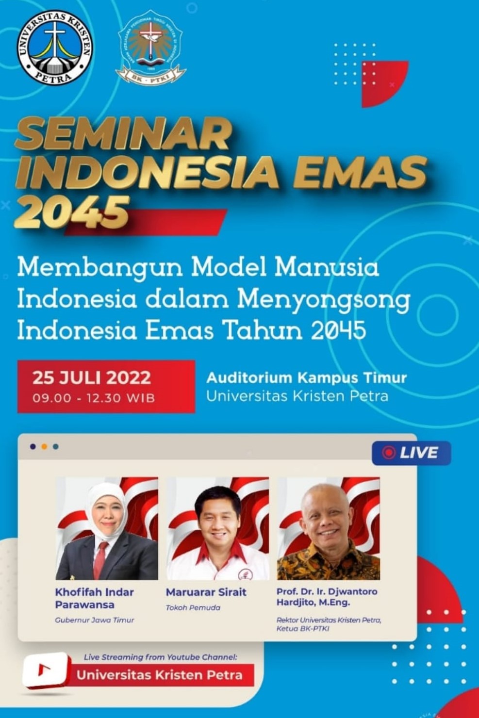 Library's collection Library's IT development CancelUniversitas Kristen Petra Surabaya pada tanggal 25 Juli 2022 jam 09.00 - 12.30 WIB, mengadakan Seminar Indonesia emas 2045. Sebagai narasumber Khofifah Indar Parawansa, Maruara Sirait, Djwantoro Hardjito. Seminar ini ditayangkan sercara live streaming melalui kanal Youtube.