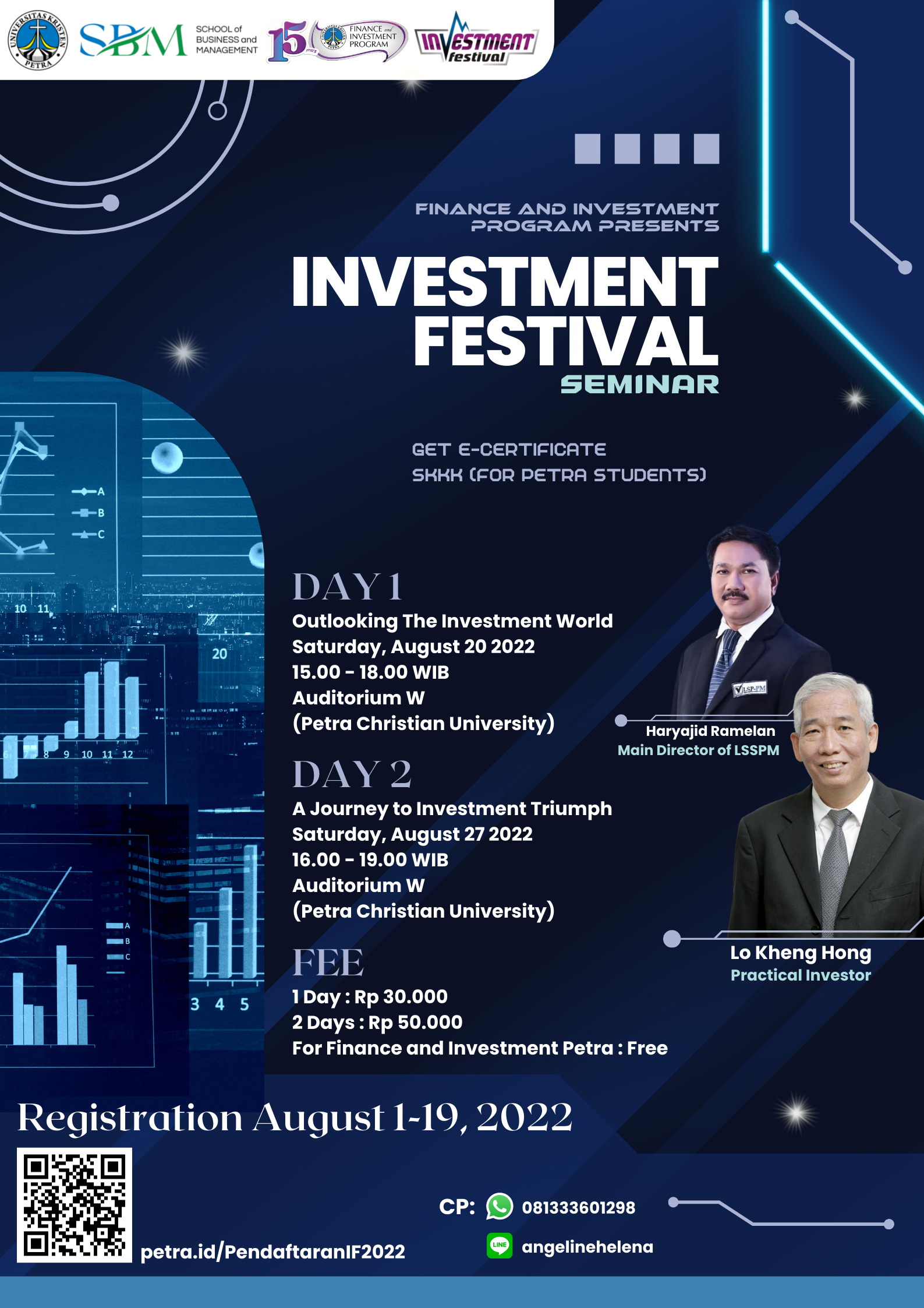 Library's collection Library's IT development CancelProgram Manajemen Keuangan Universitas Kristen Petra Surabaya, pada tanggal 20 dan 27 Agustus 2022, mengadakan acara festival seminar. Acara seminar yang diadakan pada opening ceremony dan awarding night Investment Festival. Untuk info pendaftaran bisa dilihat di http://petra.id/PendaftaranIF2022