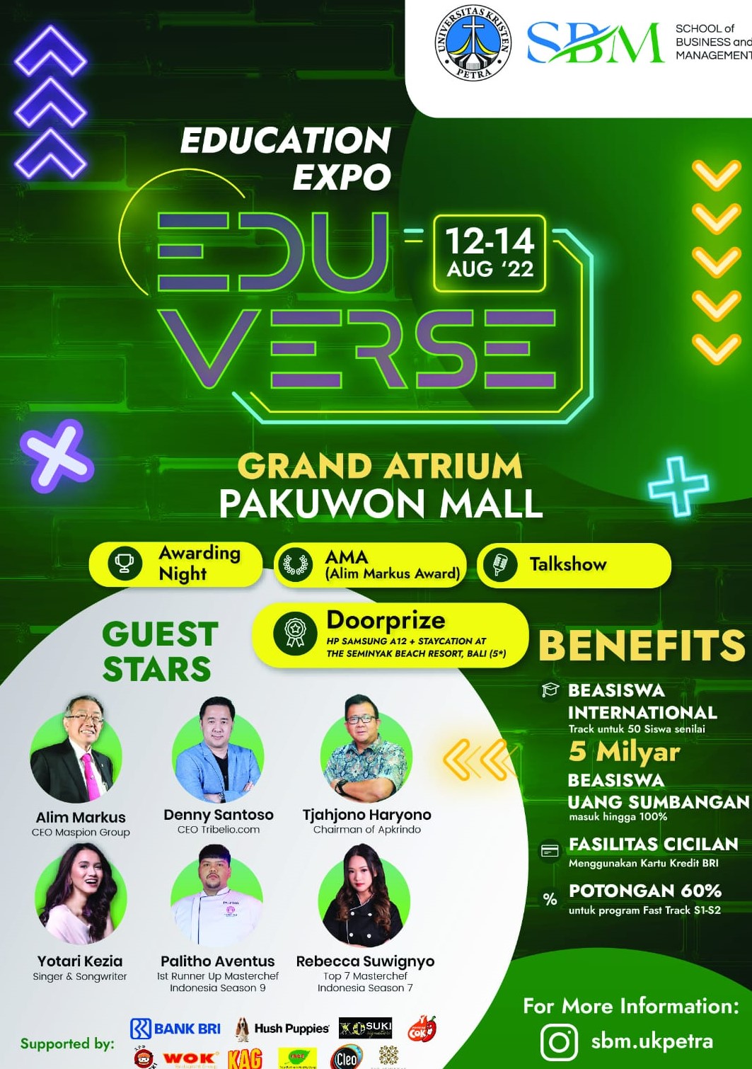 Library's collection Library's IT development CancelEduVerse merupakan pameran edukasi program-program studi yang bernaung di bawah SBM (School of Business and Management) dimana siswa-siswa SMA yang akan melanjutkan studinya ke jenjang universitas dapat berkonsultasi langsung dengan dosen-dosen dari masing-masing program studi. Selama pameran, akan diadakan pula berbagai performance dari mahasiswa dan alumni SBM. Acara ini dilaksanakan pada tanggal 12-14 Agustus 2022,bertempat di Grand Atrium Pakuwon Mall Surabaya.