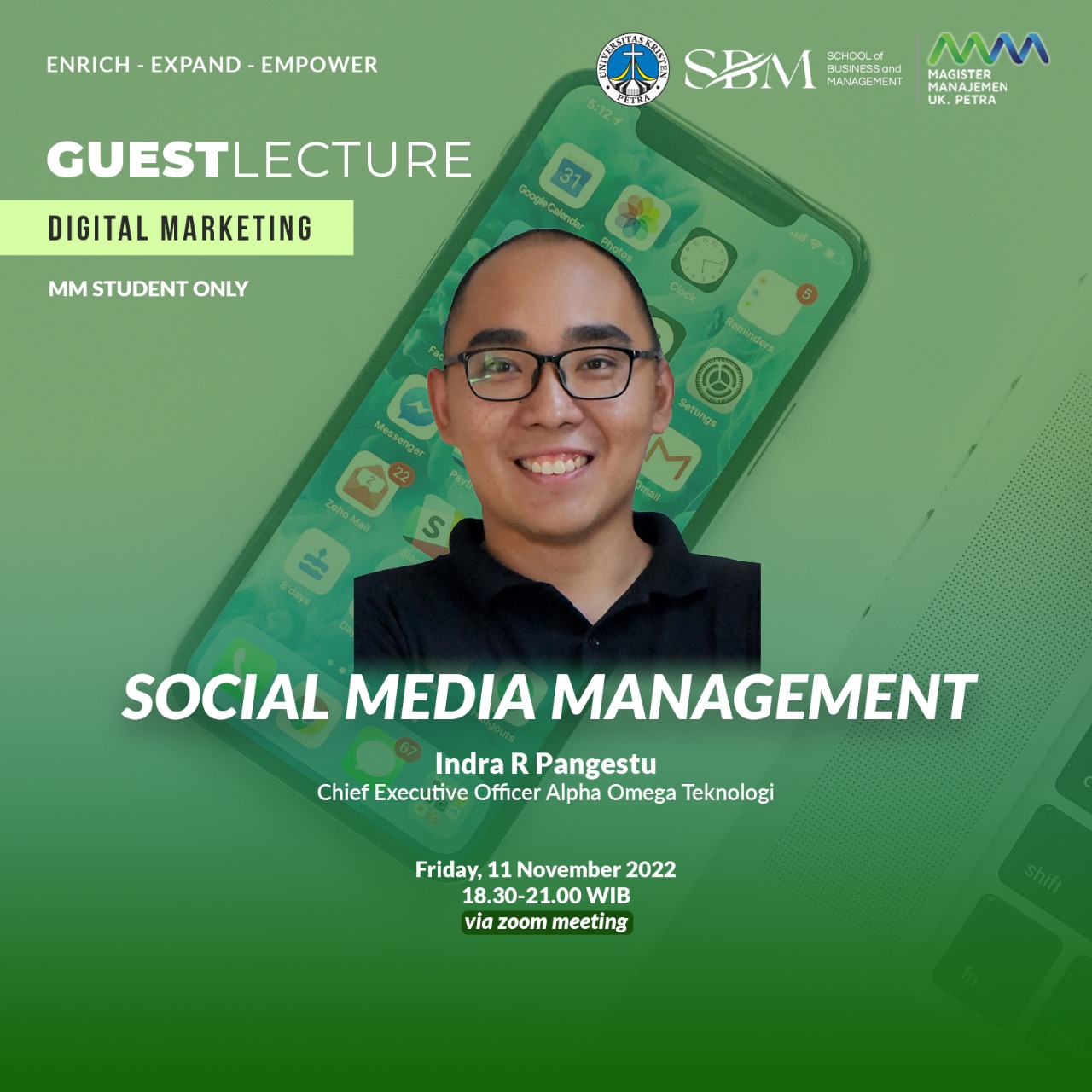 Library's collection Library's IT development CancelJumat, 11 November 2022 jam 18.30 - 21.00 WIB, Program Studi Magister Manajemen akan mengadakan kuliah tamu dengan mengangkat tema Social media management, dengan narasumber Indra R. Pangestu.