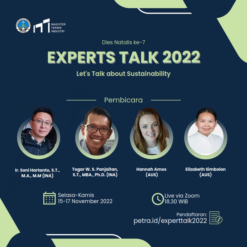 Library's collection Library's IT development CancelDalam rangka memeriahkan Dies Natalis yang ke-7 Program Studi Magister Teknik Industri UK Petra, diadakan acara Experts Talks 2022. Dengan menghadirkan beberapa narasumber yang kompeten di bidangnya. Acara ini dilaksanakan pada 15 - 17 November 2022 jam 18.30 sampai selesai, secara online melalui aplikasi Zoom.