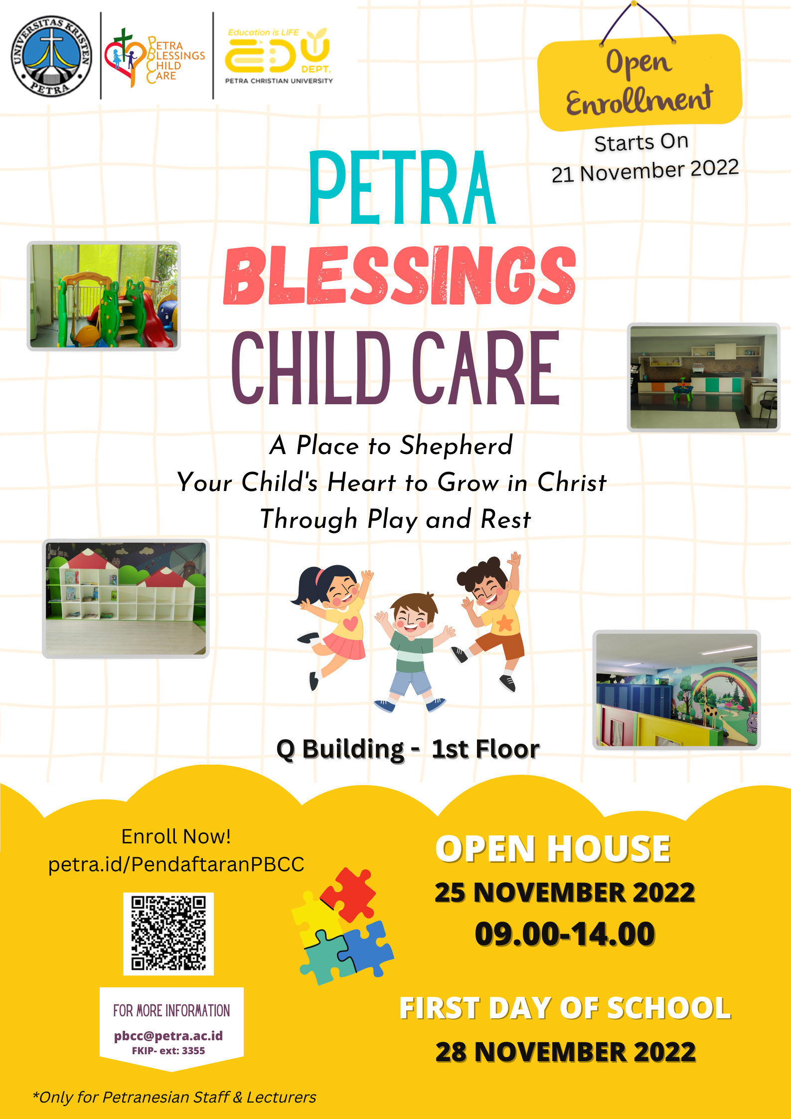 Library's collection Library's IT development CancelPetra blessing child care yang digagas oleh Program Studi Pendidikan Guru SD Universitas Kristen Petra Surabaya telah dibuka, untuk itu telah dibuka pendaftaran bagi staf Dosen dan tenaga kependidikan yang akan memanfaatkan layanan ini.