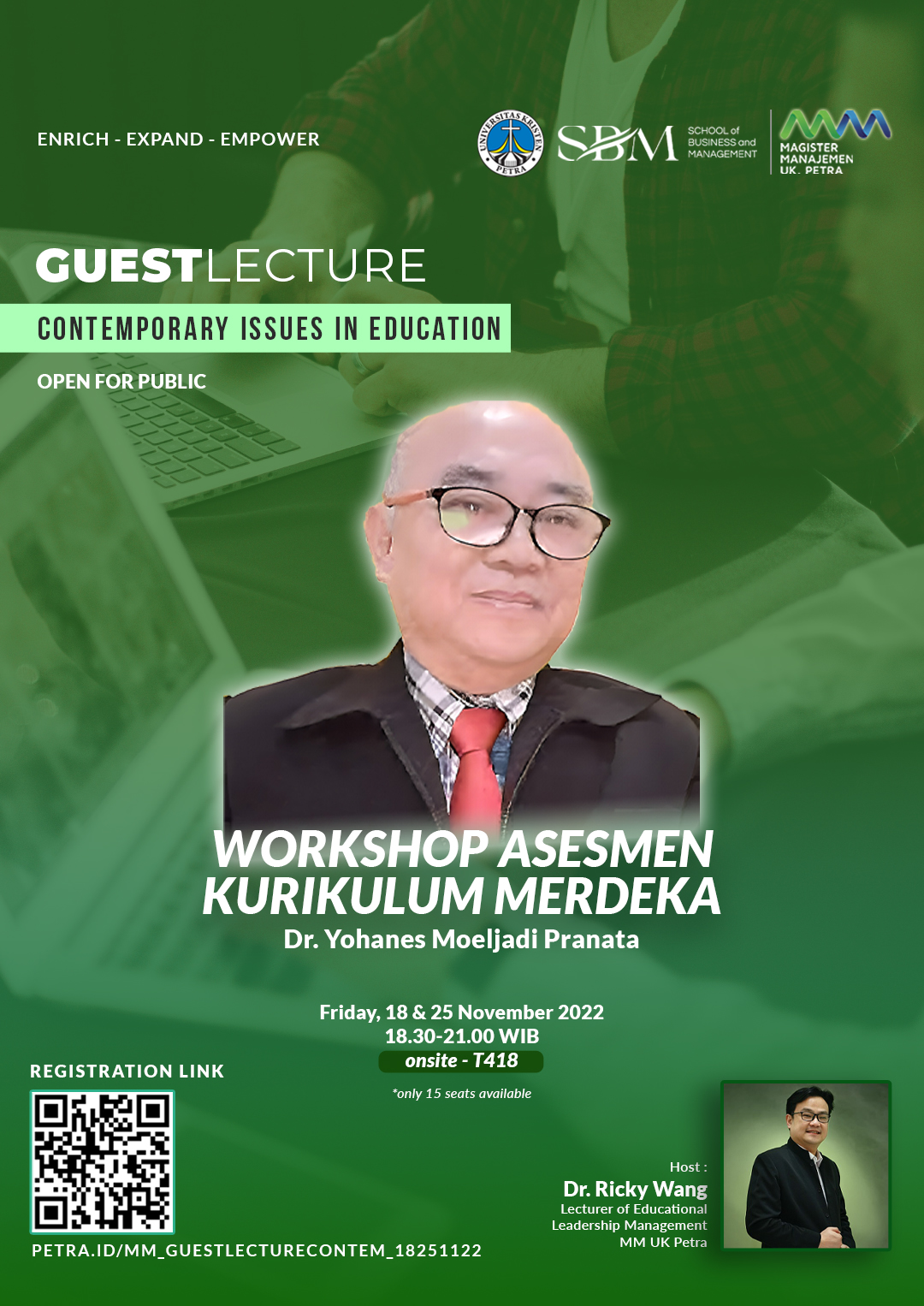 Library's collection Library's IT development CancelKuliah tamu contemporary issues in education: workshop asesmen kurikulum merdeka yang diadakan oleh Program Studi Magister Manajemen UK Petra pada tanggal 18 dan 25 November 2022 jam 18.30 - 21.00 WIB. Dengan narasumber Dr. Yohanes Moeljadi Pranata.
