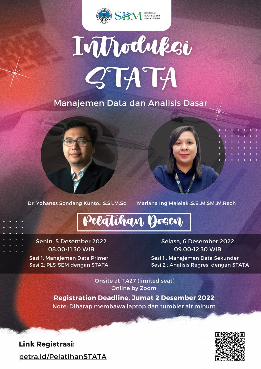 Library's collection Library's IT development CancelPengenalan aplikasi STATA kepada dosen-dosen yang merupakan salah satu program statistika yang saat ini sedang populer di dunia pendidikan berupa penyimpanan, pengolahan dan analisis data guna menunjang penelitian dosen. Acara pelatihan dosen ini diadakan oleh Program Studi Manajemen UK Petra pada tanggal 05 dan 06 Desember 2022 dengan menghadirkan pembicara Dr. Yohanes Sondang Kunto, M.Sc. dan Mariana Ing Malelak, S.E., M.Sm.
