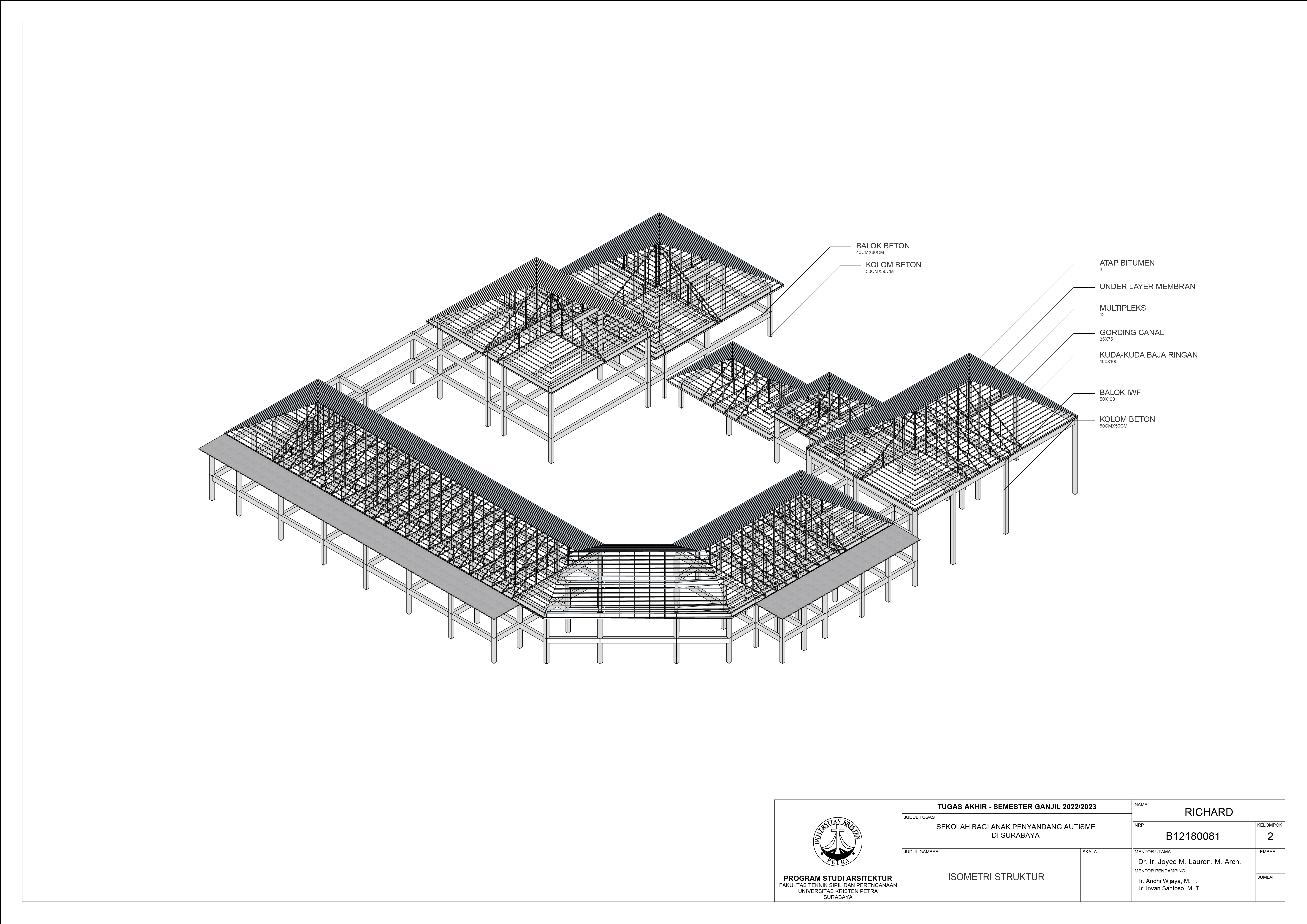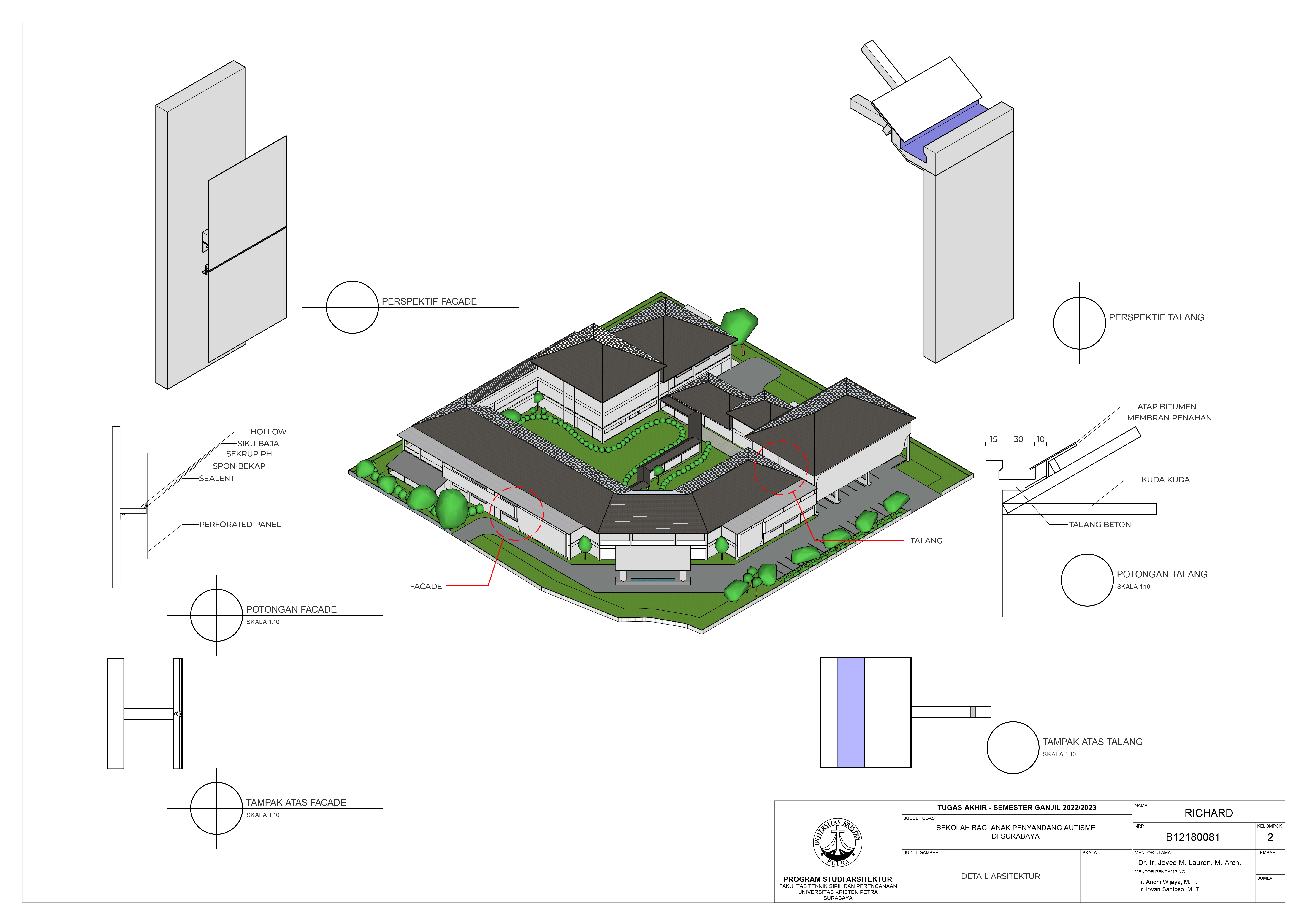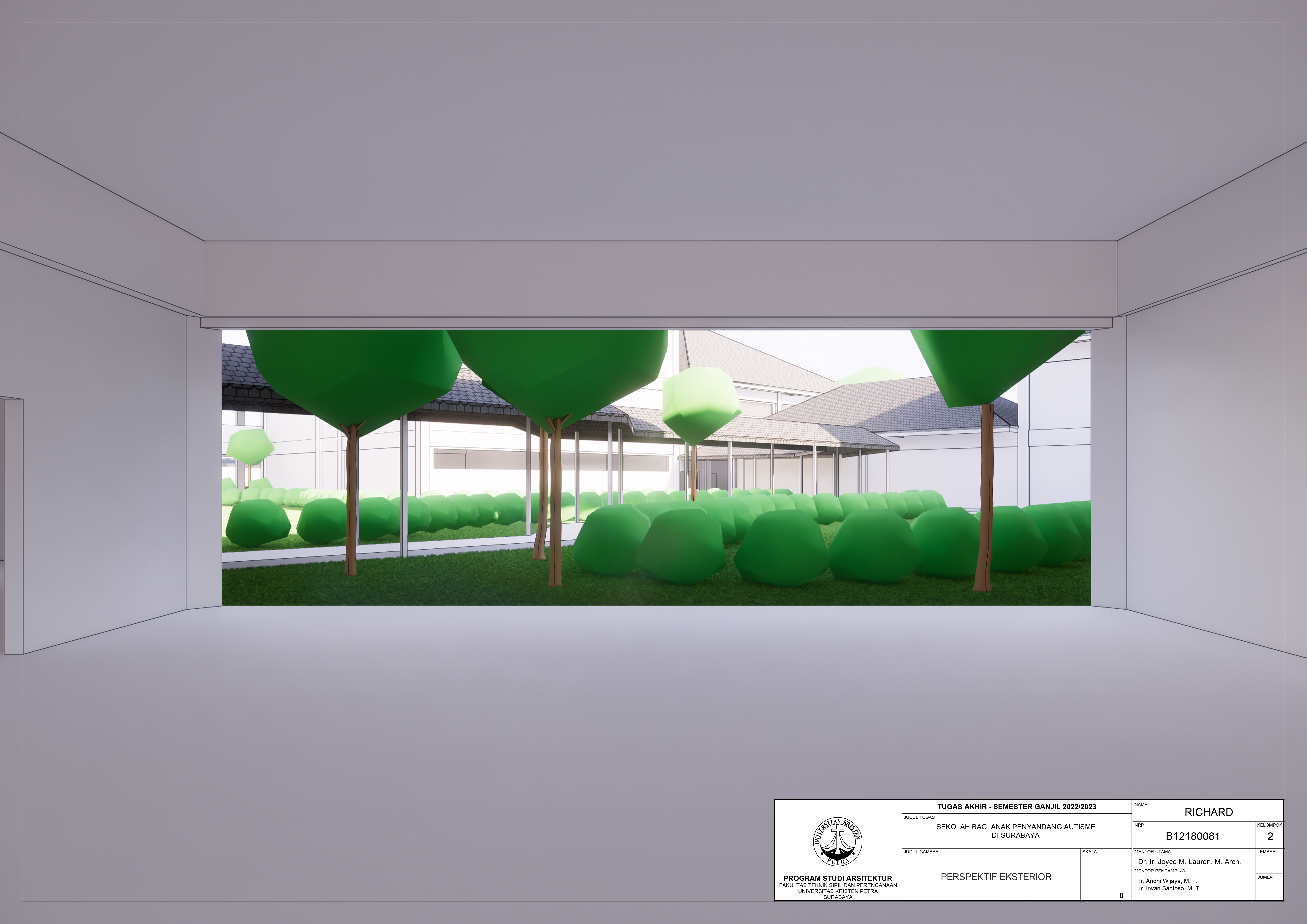 Library's collection Library's IT development CancelAnak autisme di Indonesia terus meningkat dan perlu mendapatkan jenjang pendidikan yang sesuai dengan karakter serta kriteria yang sudah diatur dalam kurikulum Indonesia. Faktanya di Indonesia khususnya di Surabaya, sekolah bagi anak penyandang autisme ini sangat minim dan juga jauh dari kriteria yang sudah ditentukan. Untuk memaksimalkan kriteria yang diperlukan tentunya akan memerlukan lahan yang besar, dan di lahan yang besar munculah permasalahan dari karakteristik anak autisme dengan susahnya navigasi dan orientasi bangunan. Proses perancangan sekolah ini menggunakan metode pendekatan arsitektur perilaku dan menekankan pada sirkulasi bangunan. Pendekatan ini akan sangat memaksimalkan kebutuhan anak penyandang autisme dalam menjalani semua rangkaian kegiatan belajar mengajar, sehingga menghasilkan keterhubungan antar ruang secara sirkular.