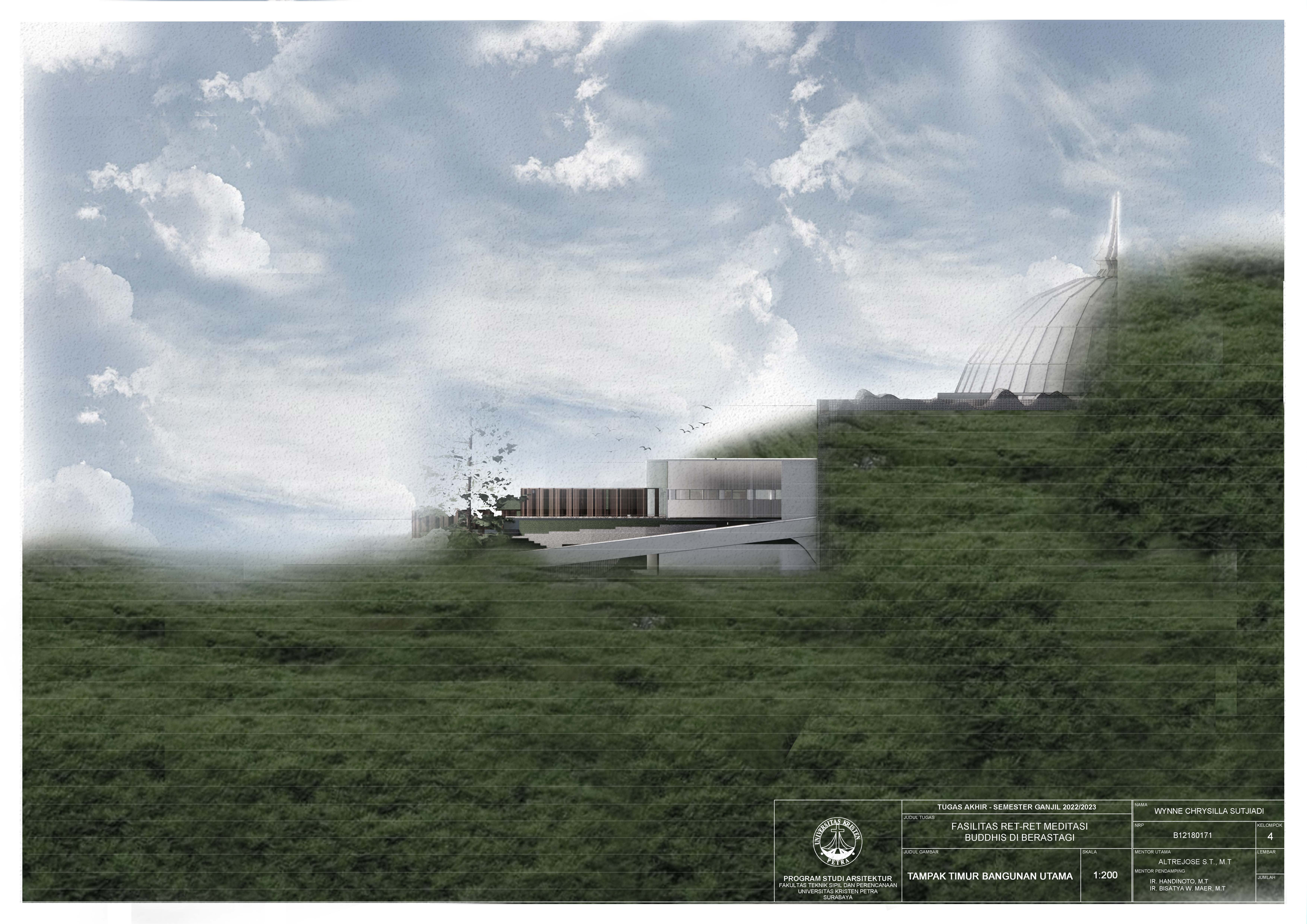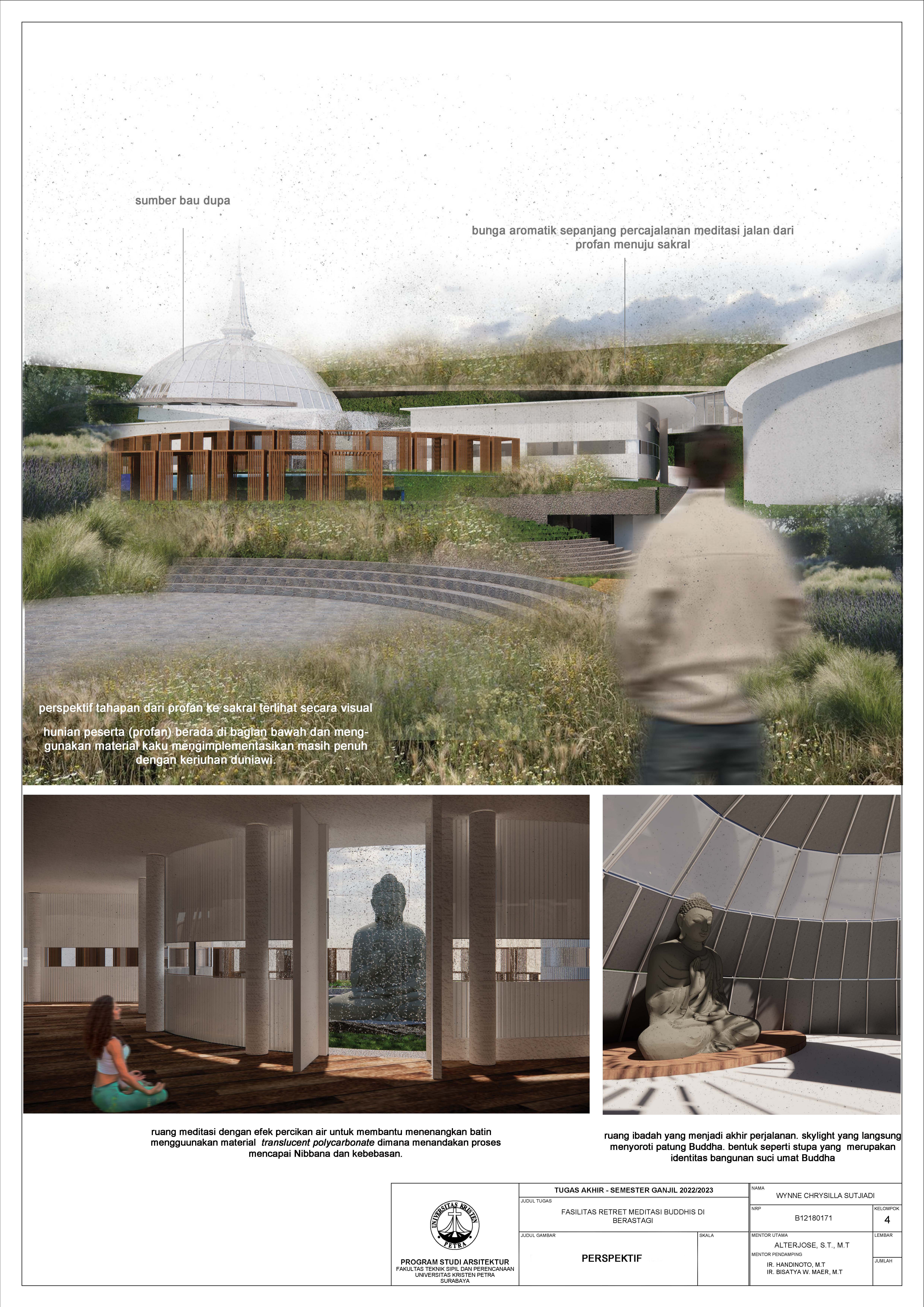 Library's collection Library's IT development CancelBangunan Fasilitas Retret Meditasi Buddhis di Berastagi ditujukan kepada pengguna sebagai salah satu wadah pengenalan lebih terhadap diri sendiri melalui pengembangan batin yang dapat menjadi jawaban dan sumber kedamaian di tengah kesibukan manusia. Meditasi merupakan salah satu sarana dalam upaya mengembangkan batin melalui pemusatan pikiran pada satu objek sehingga sangat perlu memperhatikan sarana-sarana yang menjadi objek untuk membantu penggunanya berkonsentrasi untuk mencapai ketenangan batin yang didukung juga dengan situasi lingkungan sekitarnya. Pendekatan perancangan merupakan pendekatan sikuens dengan pendalaman karakter ruang yang berfokus pada indra manusia dengan harapan ingin memberikan kesan dan pesan pada setiap bagian fasilitas agar pengguna lebih mampu merasakan maksud dari meditasi itu sendiri berupa pencapaian ketenangan dan kedamaian dari kehidupan ramai dan kesibukan sehari-hari yang didapatkan melalui pengalaman ruang yang diimplementasikan berupa permainan dimensi dan skala ruang, penggunaan material, pencahayaan, dan pemilihan warna yang dirasakan selama berada di fasilitas tersebut.