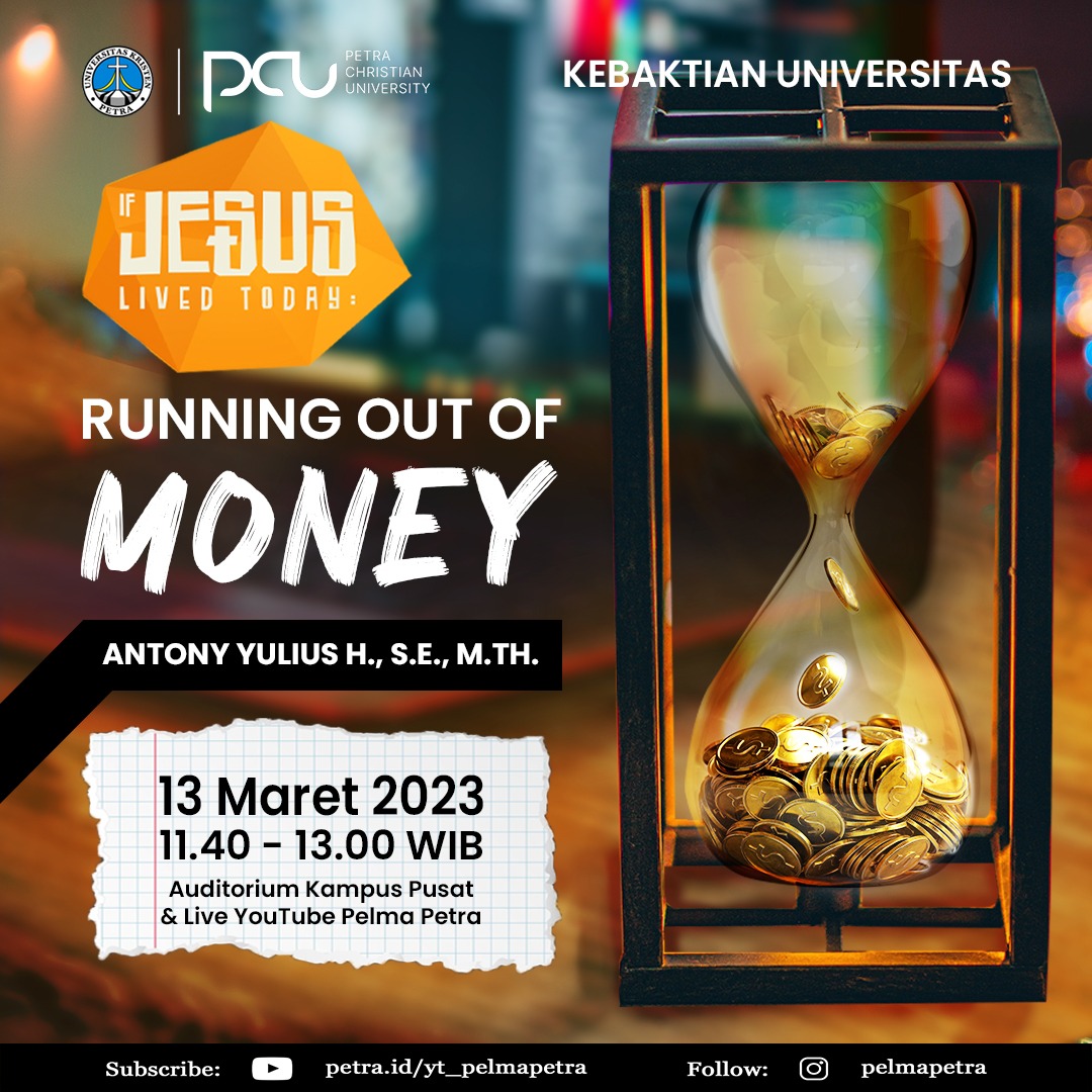 Library's collection Library's IT development CancelKebaktian Universitas setiap hari Senin, diadakan pada tanggal 13 Maret 2023 jam 11.40 - 13.00 WIB bertempat di Auditorium kampus pusat Universitas Kristen Petra Surabaya. Pada kebaktian ini mengangkat tema "if Jesus lived today running out of money" dengan pengkhotbah bapak Antony Yulius H, S.E., M.Th.