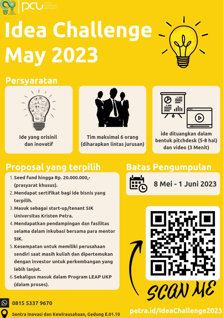 Library's collection Library's IT development CancelLembaga Penelitian dan Pengabdian Masyarakat UK Petra mengadakan kegiatan yang bernama Idea Challenge May 2023. Lomba ini bertujuan untuk memunculkan start_up yang baru di lingkungan UK Petra. Untuk batas pengumpulan karya pada tanggal 08 Mei - 01 Juni 2023. Info selengkapnya bisa dilihat di petra.id/IdeaChallenge2023.