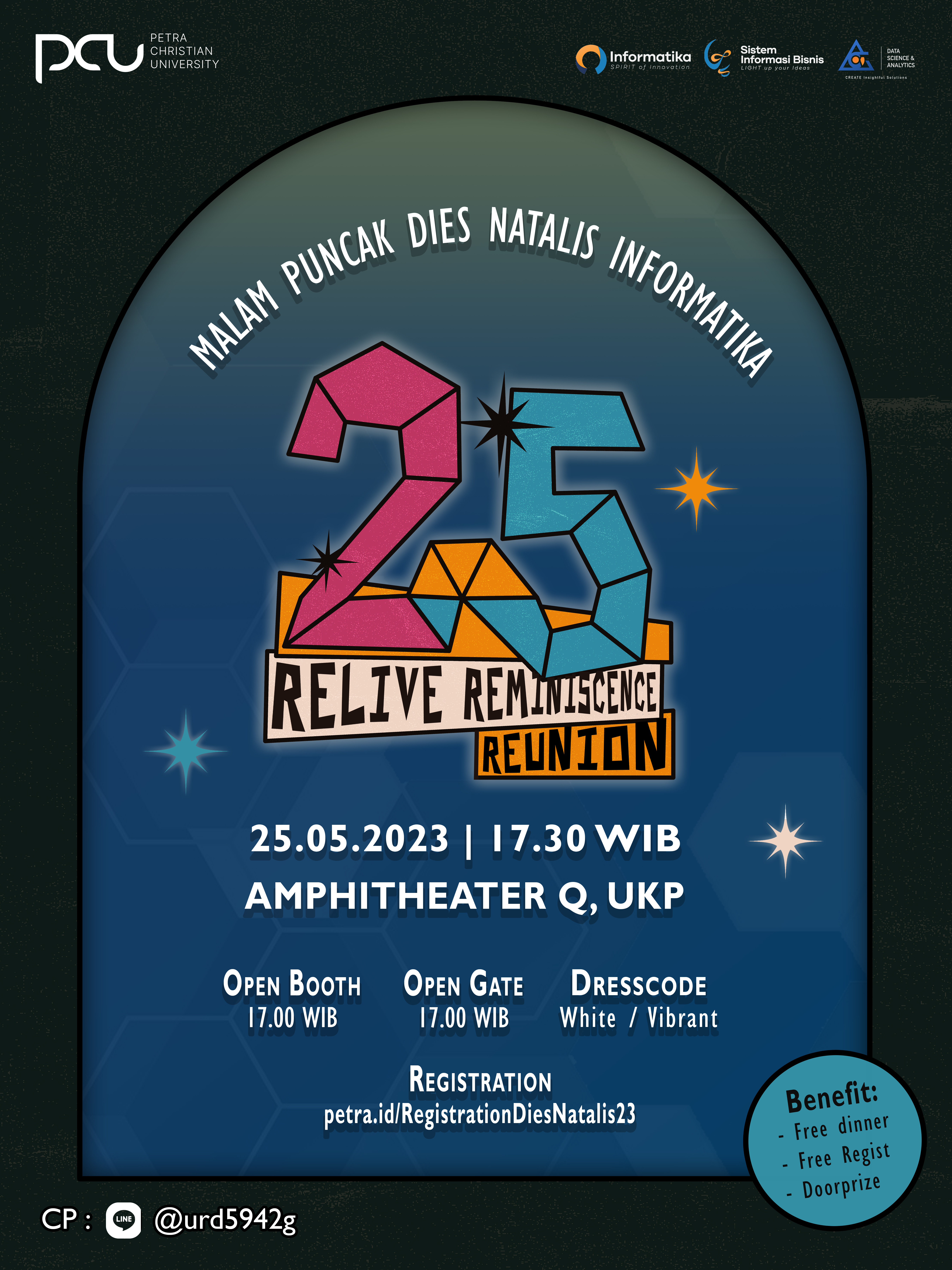 Library's collection Library's IT development CancelRangkaian acara dies natalis Teknik Informatika UK Petra diakhiri dengan acara "Malam puncak dies natalis informatika". Acara ini digelar pada 25 Mei 2023 jam 17.30 - selesai. Bertempat di Amphiteater gedung Q.