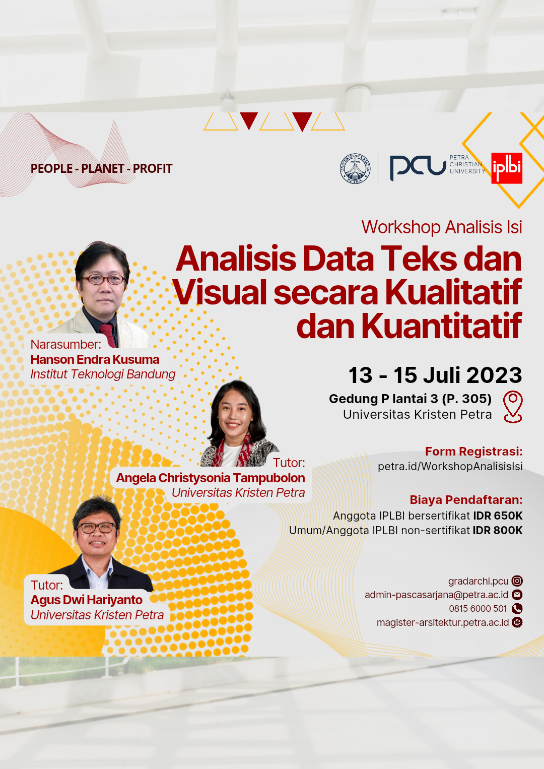 Library's collection Library's IT development CancelProgram Studi Magister Arsitektur Universitas Kristen Petra Surabaya, pada 13-15 Juli 2023 bertempat di gedung P.305. mengadakan acara Workshop metode penelitian - analisis isi: analisis data teks dan visual secara kualitatif dan kuantitatif. Dengan mengundang narasumber Hanson Endra Kusuma dan Angela C. Tampubolon serta Agus Dwi Hariyanto sebagai moderator.