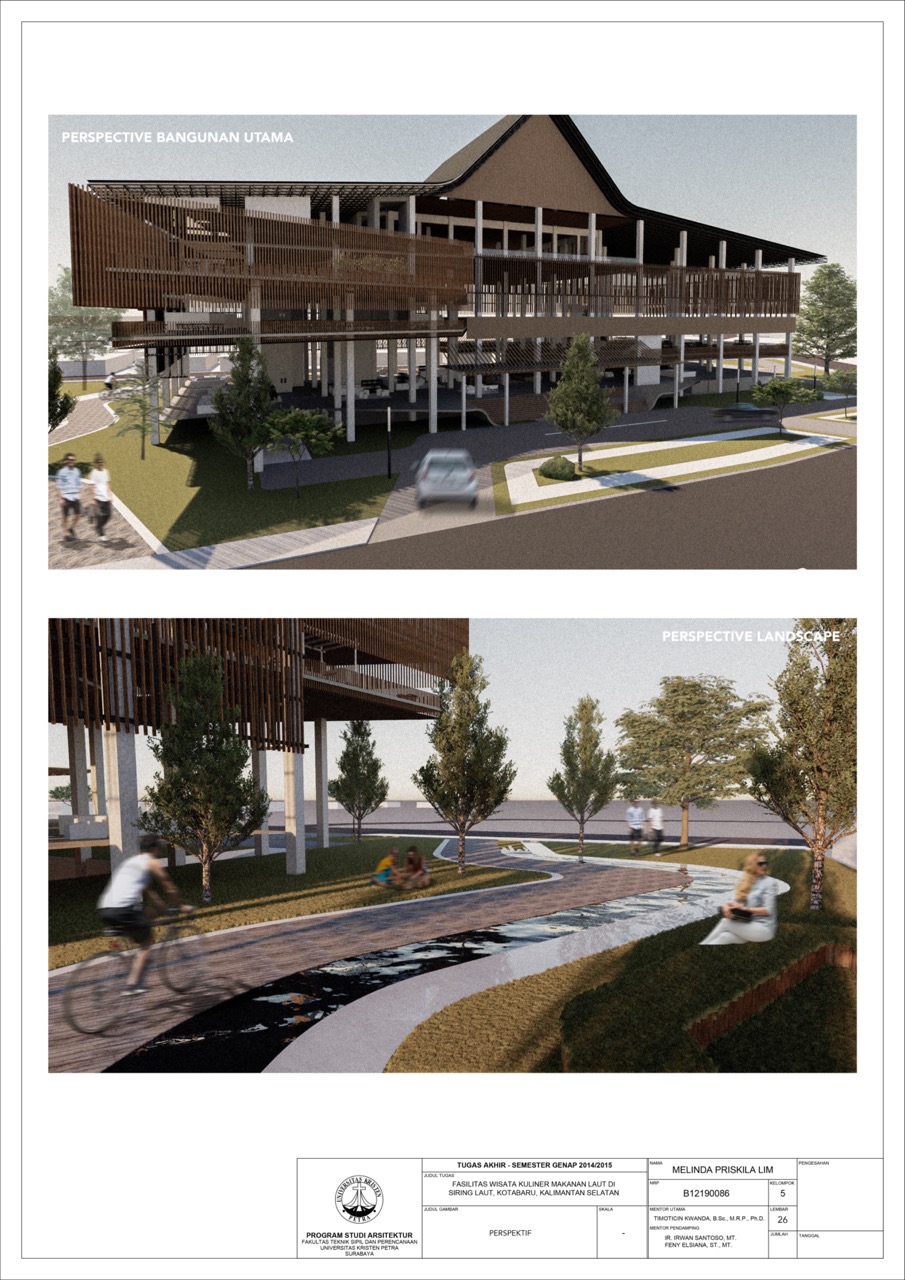 Library's collection Library's IT development CancelKabupaten Kotabaru merupakan wilayah kepulauan yang diapit oleh selat Makasar dan Laut Jawa. Potensi perikanan tangkap laut di kabupaten ini sangatlah tinggi dan menjadi unggulan. Oleh sebab itu, Kotabaru terkenal dengan banyaknya kampung nelayan dan hasil tangkapan ikannya yang melimpah. Salah satu kampung nelayan yang ada di Kotabaru yaitu Rampa. Rampa sendiri merupakan salah satu kampung nelayan terbesar yang ada di Kotabaru. Kampung nelayan yang dulunya kumuh sekarang sudah dibenahi oleh pemerintah setempat dan ingin dijadikan desa wisata. Namun walaupun sudah dibenahi dan ingin dijadikan desa wisata, kesejahteraan keluarga nelayan yang ada di Rampa masih di kondisi pra-sejahtera. Selain itu tidak ada destinasi wisata kuliner yang ada di kabupaten ini. Oleh sebab itu, fasilitas wisata kuliner makanan laut ini menjadi fasilitas yang dapat membantu mengangkat kesejahteraan ekonomi keluarga nelayan Rampa dan menjadi destinasi wisata kuliner makanan laut yang memberikan pengalam baru bagi pengunjungnya.