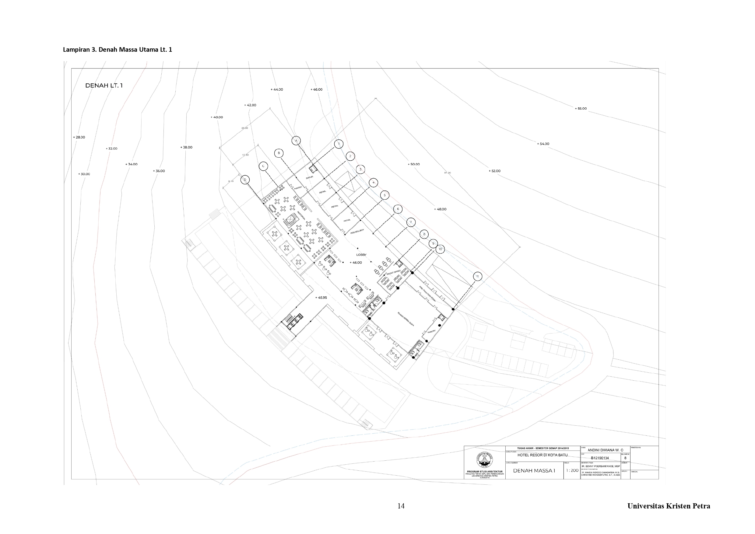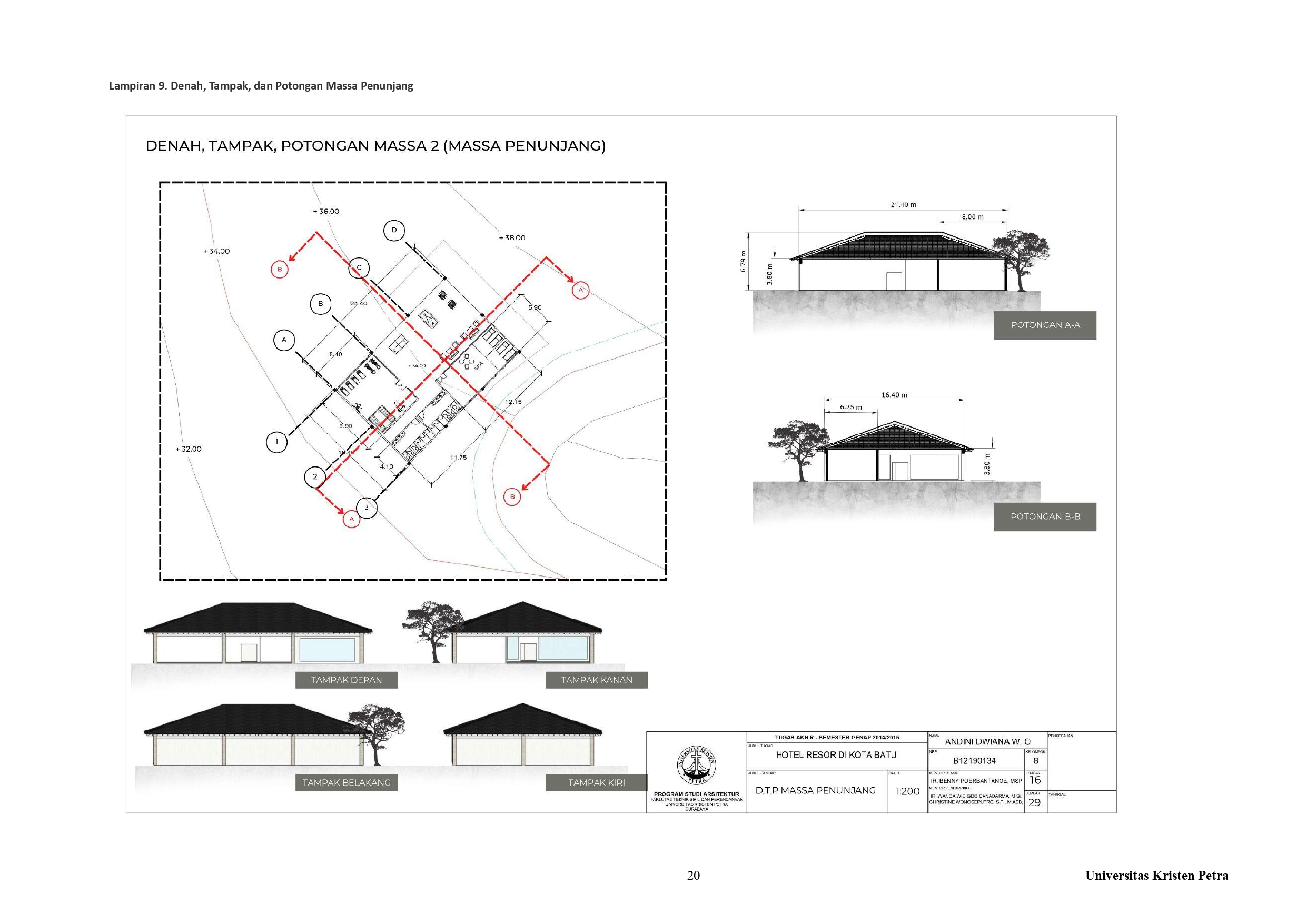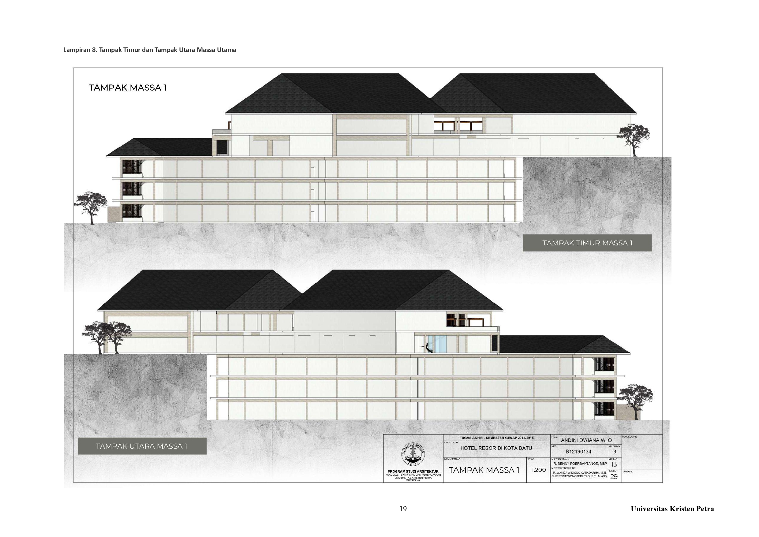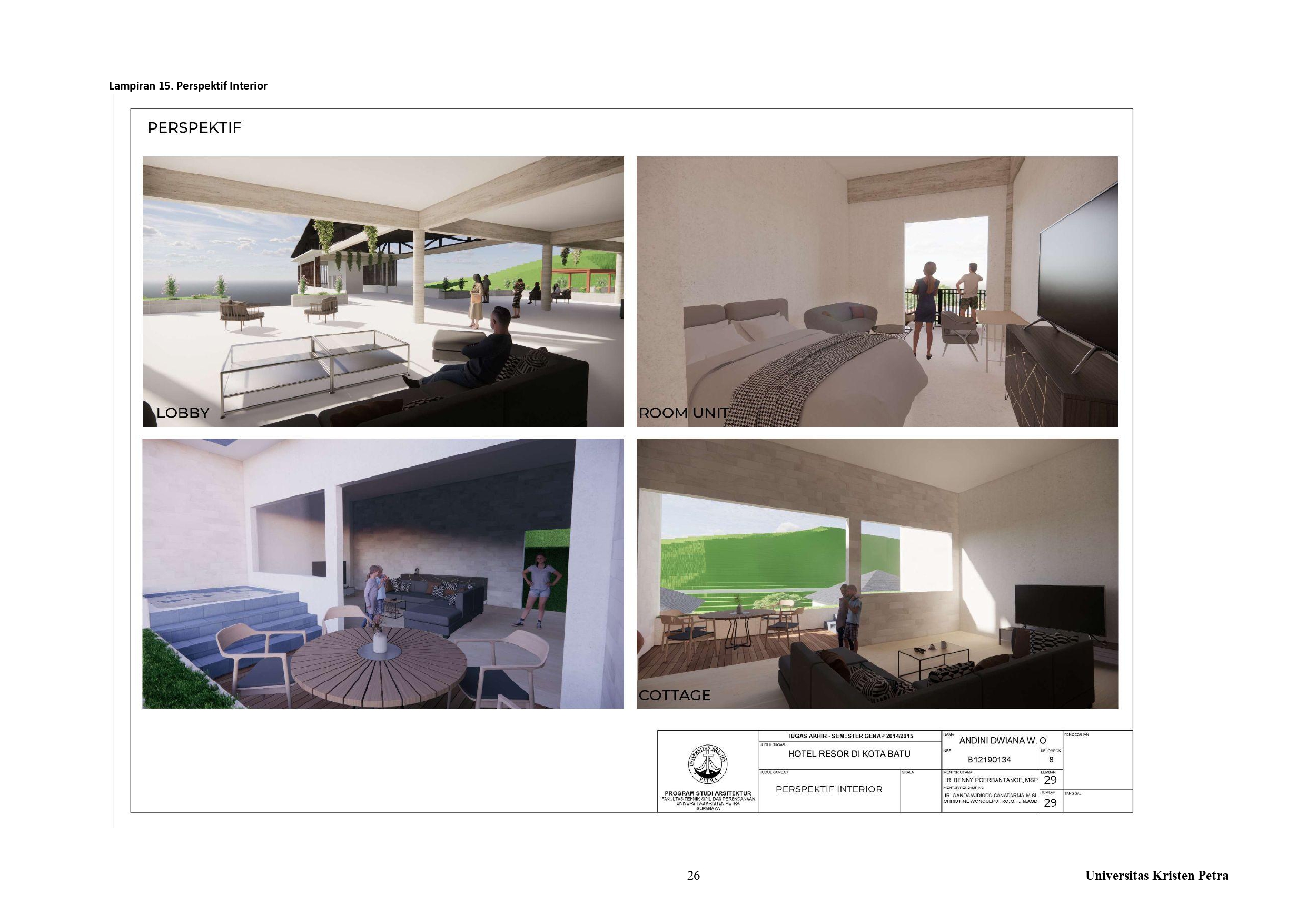 Library's collection Library's IT development CancelKota Batu sebagai salah satu kota wisata terpopuler di Jawa Timur memiliki banyak sekali objek wisata, baik objek wisata buatan maupun objek wisata alami. Terdapat banyak sekali objek wisata yang terdapat di Kota Batu, baik objek wisata alam maupun objek wisata buatan. Selain terkenal akan hawa sejuk dan objek wisatanya kota Batu juga terkenal akan pemandangannya yang indah. Namun, sebagian besar kegiatan wisata berpusat di Kecamatan Batu, yang menjadikan penyebaran tidak merata terhadap fasilitas-fasilitas bagi para wisatawan. Untuk mengatasi penyebaran fasilitas yang tidak merata, maka diperlukan khususnya fasilitas akomodasi bagi wisatawan di kawasan lain diluar Kecamatan Batu. Salah satu kawasan Kota Batu yang memiliki banyak objek wisata adalah Kecamatan Bumiaji di Desa Tulungrejo. Terletak di sisi utara Kota Batu, yang merupakan dataran tinggi Kota Batu maka cenderung memiliki lahan kontur dan hawa yang lebih sejuk/dingin dari Kecamatan Batu. Maka pendekatan yang digunakan adalah pendekatan bioklimatik, dengan memperhatikan arah gerak matahari dan curah hujan di sekitar tapak. Pendekatan ini diterapkan berupa fasad dinding yang menghadap ke sisi barat dan barat daya. Fasad yang digunakan berupa balkon dan fasad kisi kayu, sehingga sinar dan panas matahari yang masuk ke dalam bangunan dapat berkurang dan pengguna dapat beraktivitas dengan nyaman di dalam bangunan.