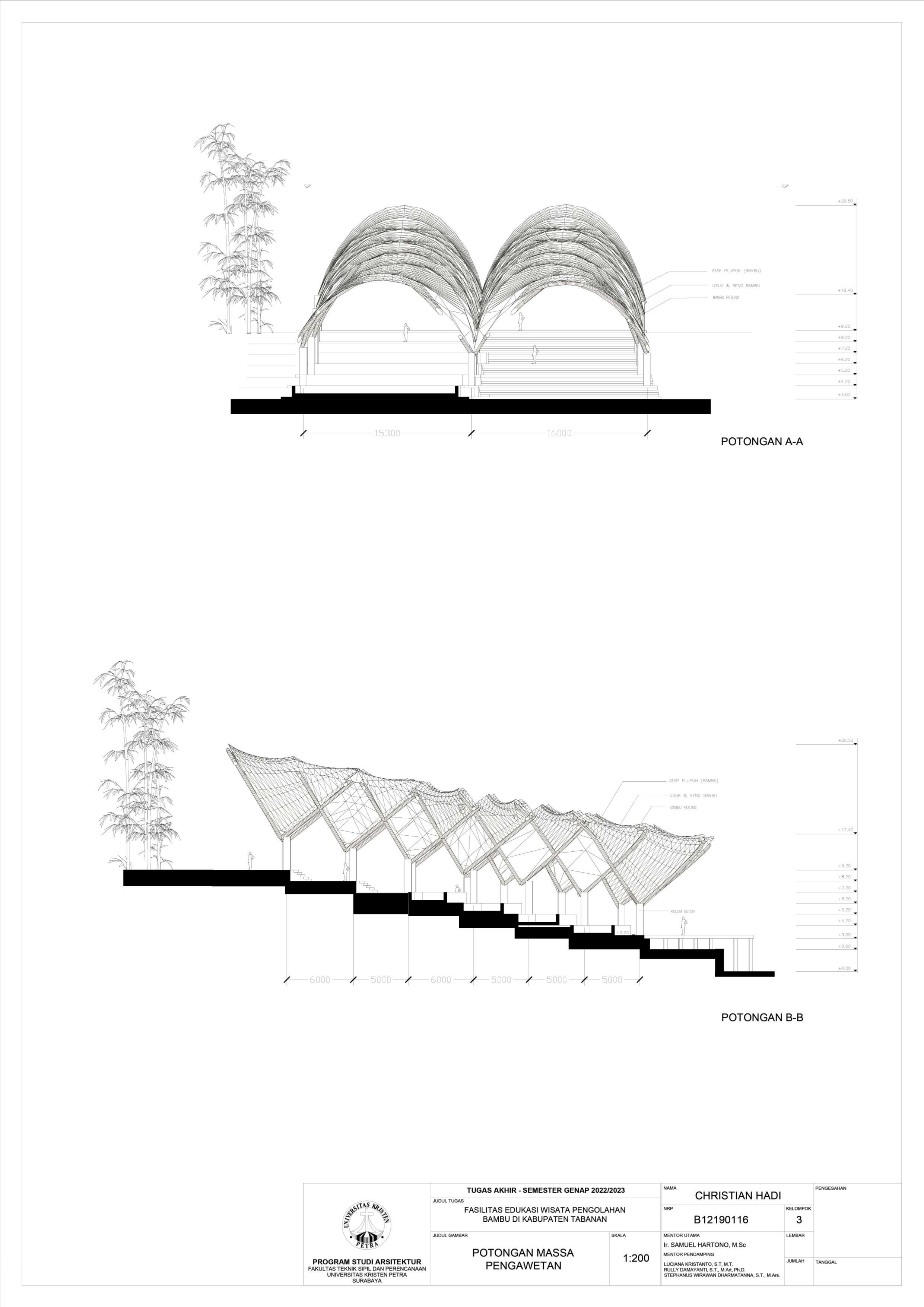 Library's collection Library's IT development CancelBambu kembali mendapatkan perhatian sebagai hasil alam yang memiliki nilai ekonomi menjanjikan. Namun, potensi bambu di Indonesia masih kurang diolah meskipun tersedia hutan bambu yang melimpah. Pemerintah melalui Kementerian Lingkungan Hidup dan Kehutanan (LHK) saat ini sedang mengembangkan strategi nasional bagi industri bambu rakyat, salah satunya melalui program 1000 Desa Bambu. Berangkat dari permasalahan tersebut, muncul gagasan untuk menyediakan fasilitas edukasi wisata yang dapat menggugah minat masyarakat terhadap bambu dan pengolahannya. Fasilitas ini berlokasi di sebelah hutan bambu Sandan, Desa Bangli, Kecamatan Baturiti, Kabupaten Tabanan. Terdapat fasilitas edukasi, yaitu pengawetan dan workshop bambu, dan fasilitas wisata, yaitu penginapan dan kafe. Pengunjung perlu terekspos terhadap bambu untuk menggugah keingintahuan mereka sehingga diterapkan pendekatan struktur dalam desain. Penerapannya adalah dengan dominasi penggunaan struktur arch bambu pada bangunan-bangunan yang ada dalam fasilitas ini. Bentuk melengkung dari arch tersebut dapat menunjukkan fleksibilitas struktur bambu. Struktur pada tiap massa bangunan juga dibuat bervariasi untuk menunjukkan ragam struktur bambu. Setelah pengunjung tergugah karena melihat berbagai cara penerapan bambu tersebut, diharapkan pengunjung tertarik mempelajari lebih jauh dan mencoba sendiri untuk mengeksplorasi bambu.
