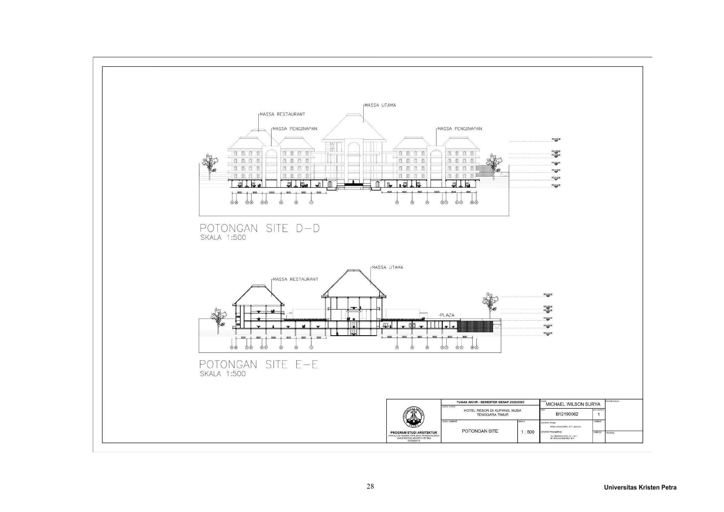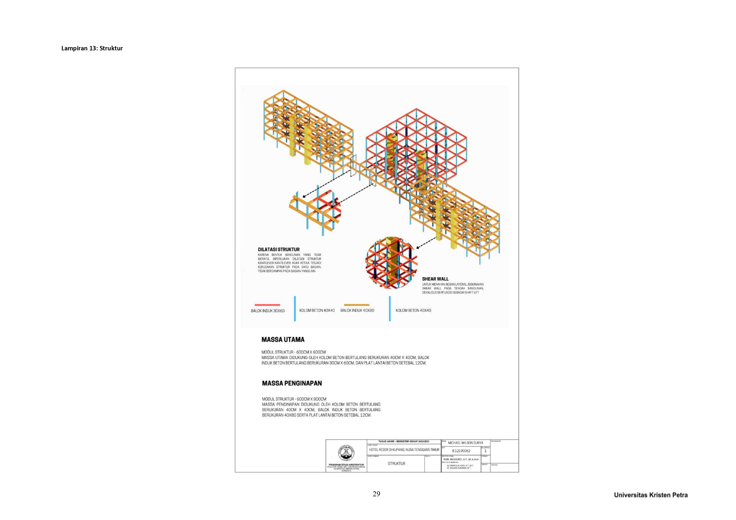 Library's collection Library's IT development CancelKota Kupang merupakan ibu kota Provinsi Nusa Tenggara Timur (NTT) yang memiliki potensi pariwisata yang besar. Kota Kupang memiliki rangkaian pantai karang yang indah dan juga memiliki banyak objek wisata yang unik dan jarang ditemui di daerah lain. Budaya khas NTT, seperti kain tenun tradisional, rumah adat, dan masakan tradisional memiliki potensi yang sangat besar untuk mendatangkan wisatawan lokal dan mancanegara. Dengan potensi wisata yang besar ini, dirancanglah sebuah "Hotel Resor di Kupang" yang terdesain untuk menunjukkan keindahan alam kota Kupang sekaligus menampilkan kebudayaan khas NTT. Fasilitas penginapan ini dirancang dengan suasana tenang dan tentram, serta jauh dari keramaian kota dengan desain arsitektural yang memberikan pengalaman berlibur dan bersantai terbaik dengan menyaksikan keindahan pantai dan budaya NTT. Desain "Hotel Resor di Kupang" ini menggunakan pendekatan arsitektur vernakular dan teori “Hybrid Architecture” oleh Robert Venturi, untuk menampilkan kekhususan arsitektur dan desain lokal.
