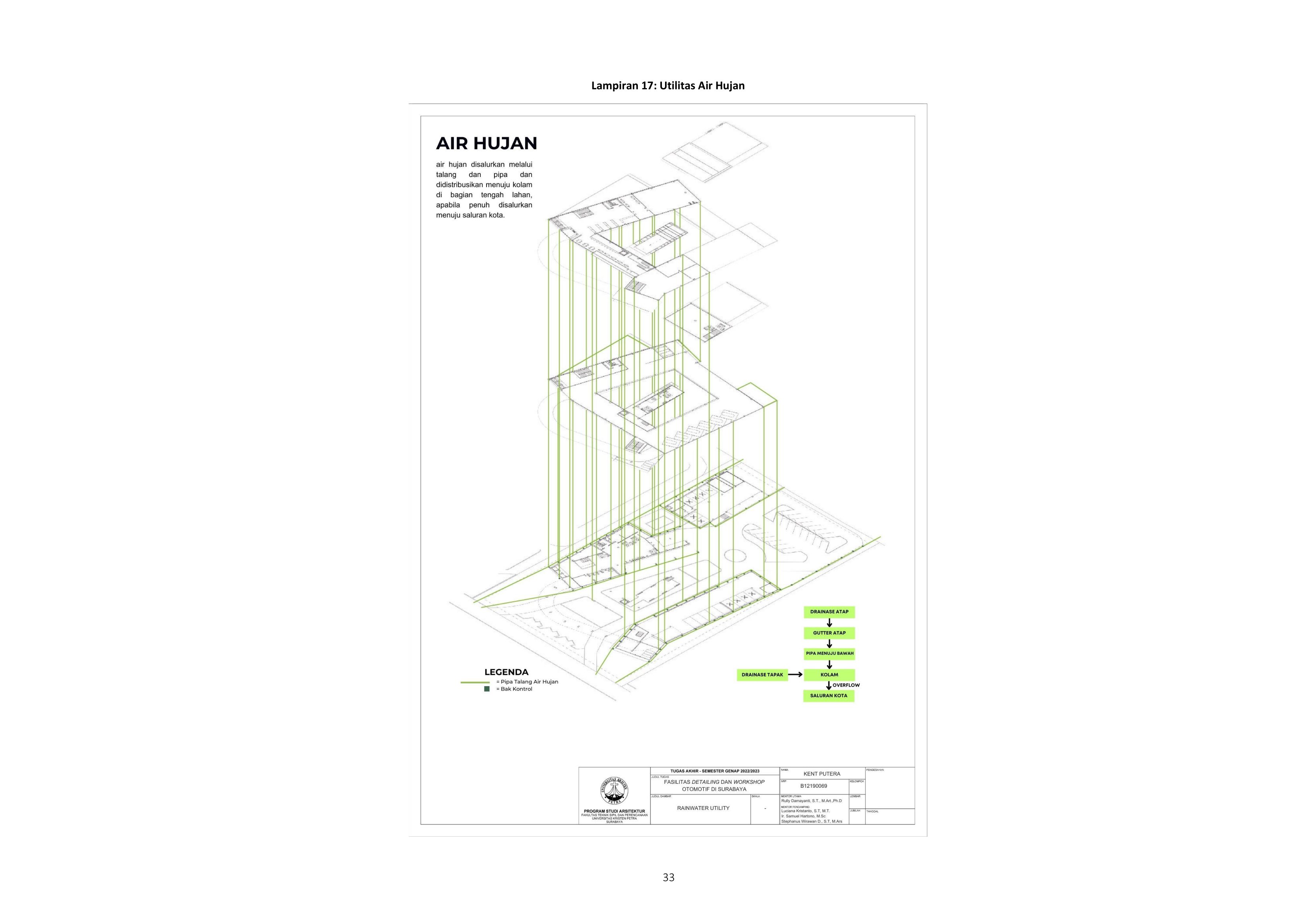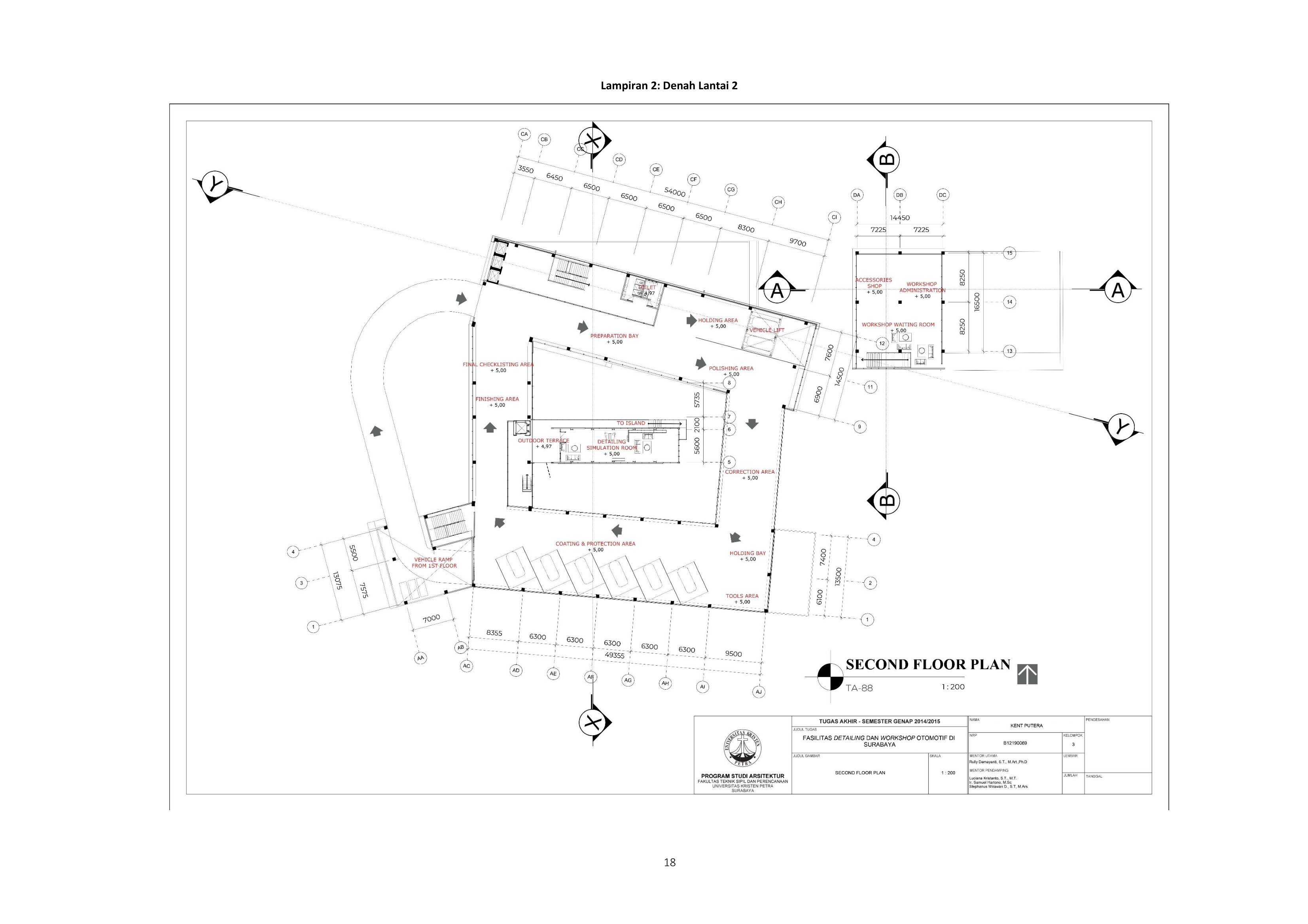 Library's collection Library's IT development CancelIndustri otomotif di Indonesia mengalami perkembangan yang cukup pesat. Salah satu sektor bisnis otomotif yang cukup populer adalah sektor bisnis detailing kendaraan bermotor. Auto detailing adalah proses perawatan eksterior dan interior kendaraan. Terdapat 5 proses utama yang harus dilakukan secara berurutan dalam detailing. Namun, menindak lanjuti permasalahan fasilitas detailing yang terdapat di Surabaya, meliputi sarana prasarana yang kurang baik, serta pemahaman masyarakat kurang mengenai perawatan kendaraan bermotor. Oleh karena itu, diperlukan sebuah fasilitas auto detailing yang sesuai dan bersifat spesifik yang dapat mengedukasi masyarakat luas, serta mewadahi aktivitas komunitas penghobi otomotif. Fasilitas ini dirancang berlokasi pada Surabaya barat, di Jl. Mayjend Jonosewojo. Fasilitas Detailing dan Workshop Otomotif di Surabaya bertujuan untuk mengakomodasi kebutuhan perawatan kendaraan bermotor dan mengedukasi masyarakat luas mengenai detailing. implementasi kesesuaian program kerja dengan tapak dan lingkungan sekitarnya dengan memperhatikan utilitas dan sirkulasi kendaraan berupa sirkulasi secara linier, serta transisi dan kesan ruang yang berbeda setiap fungsi ruang proses yang menjadi upaya penyelesaian masalah yang ada dalam desain. Pendekatan yang dilakukan dalam desain adalah pendekatan spasial dan sistem sirkulasi menggunakan teori dari Francis D.K. Ching sebagai pedoman.