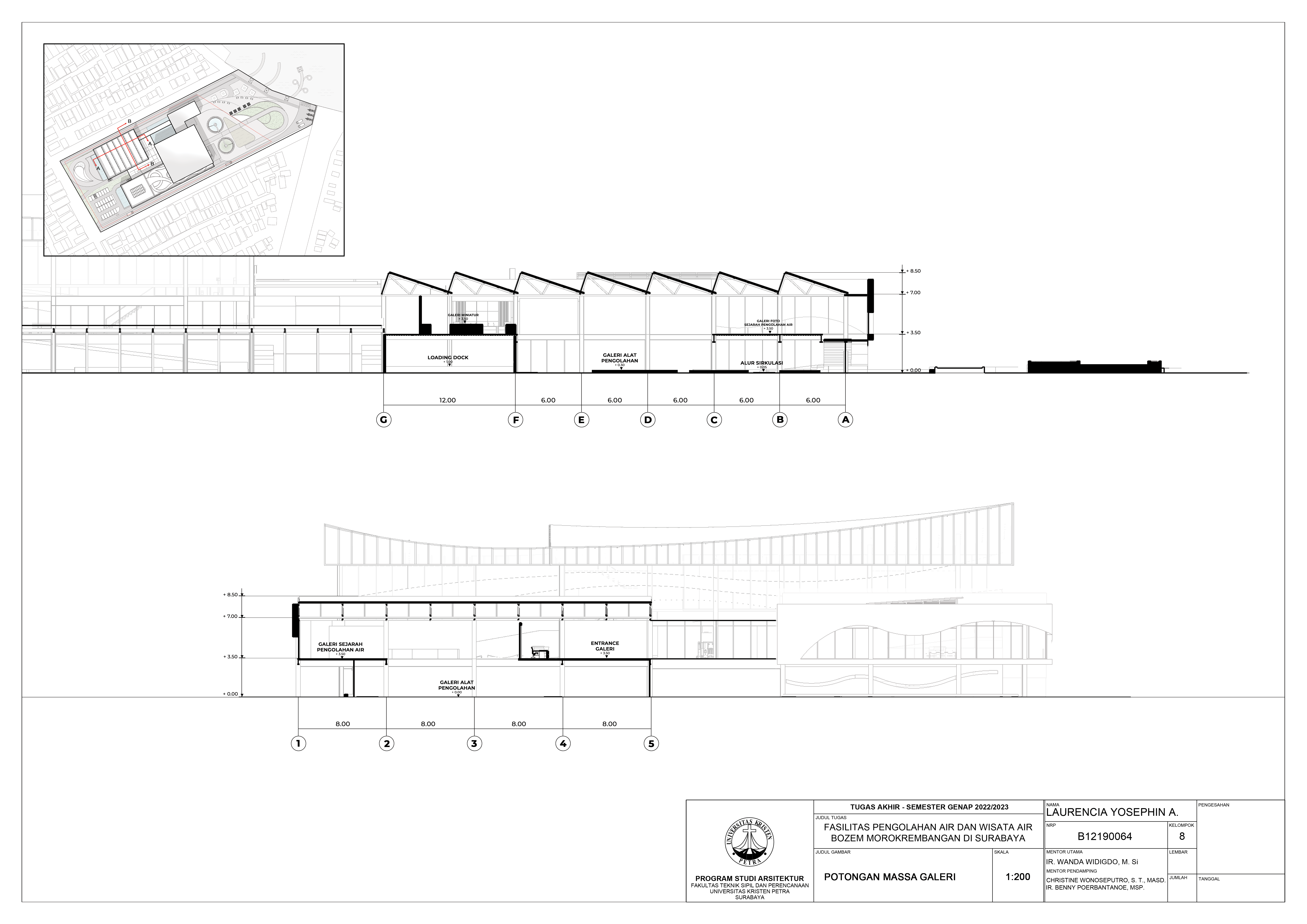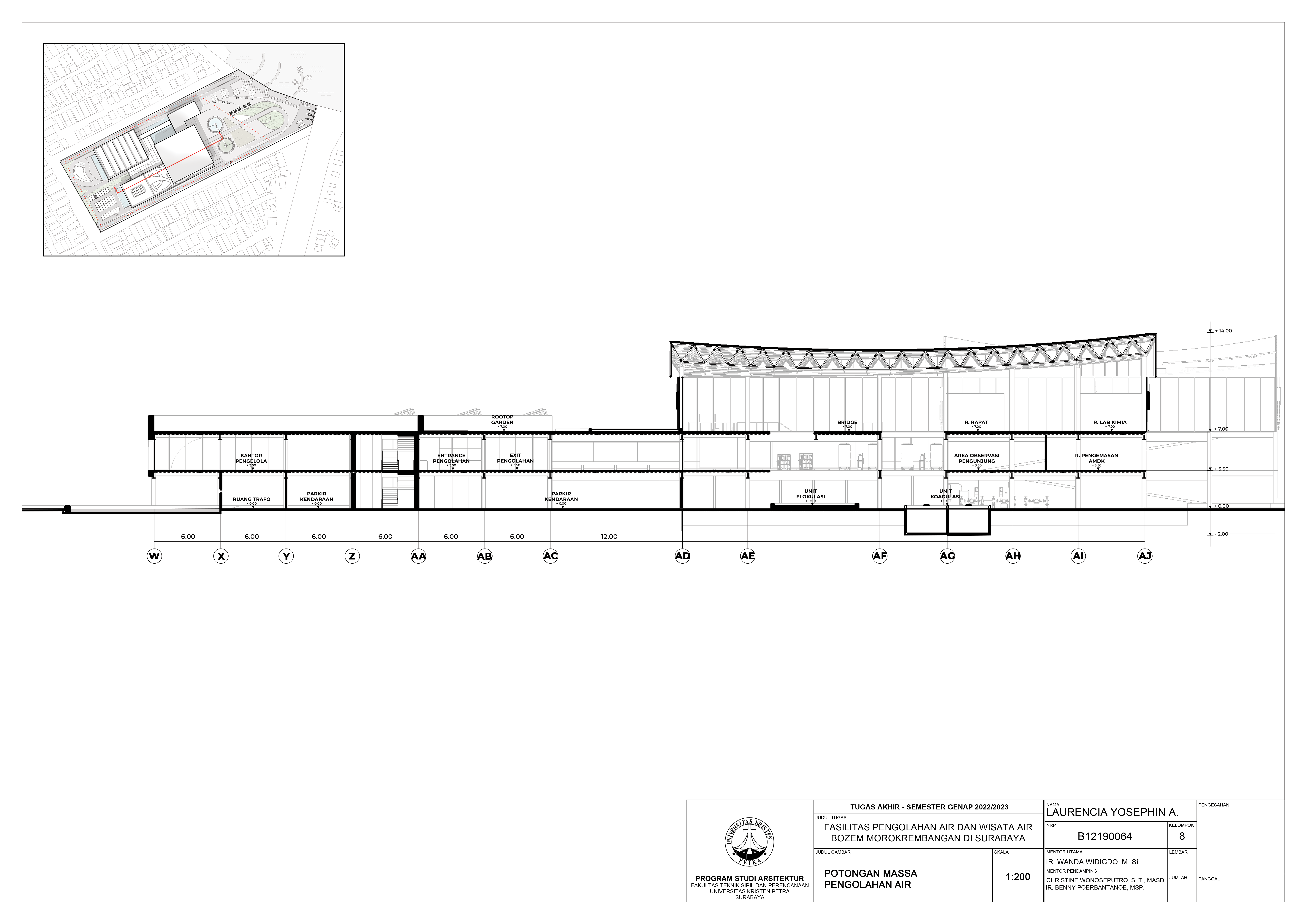 Library's collection Library's IT development CancelBozem Morokrembangan merupakan kolam penampung air hujan dan air sungai paling besar di yang memiliki banyak potensi yang belum digali. Pemerintah Kota Surabaya telah menyatakan beberapa wacana untuk menjadikan bozem sebagai objek wisata lokal, namun belum dapat diwujudkan karena permasalahan sampah yang terbawa dari sungai yang berdekatan dengan pemukiman kumuh dan perumahan liar, dan endapan bahan kimia yang belum terselesaikan. Fasilitas didesain untuk membantu kinerja Bozem Morokrembangan dengan melakukan pengolahan air secara berkala. Pengolahan air dilakukan dalam skala kecil, sekaligus digunakan untuk sarana pembelajaran untuk memberikan pemahaman pentingnya menjaga kebersihan kepada para penduduk sekitar. Sejalan dengan rencana pemerintah, bozem yang airnya diolah secara terus menerus akan dijadikan objek wisata. Objek wisata pada fasilitas yang terdesain difokuskan pada area pinggir bozem. Pengunjung yang datang harus mengikuti rangkaian proses dalam beberapa massa untuk melengkapi pemahaman penduduk. Dari situ, solusi yang telah direncanakan, digunakan pendekatan sirkulasi linear yang dapat mengarahkan pengunjung dari satu titik ke titik lain untuk memaksimalkan pemahaman secara runtut tentang proses pengolahan air bozem. Penerapan sirikulasi linear pada desain adalah pembatasan alur pengunjung. Mulai dari awal masuk, pengunjung akan diarahkan dengan pembatasan ruang gerak. Pintu masuk dan keluar pengunjung memiliki arah yang berbeda dan diberikan pembatas untuk menunjukkan arah yang pasti dituju secara berurutan.