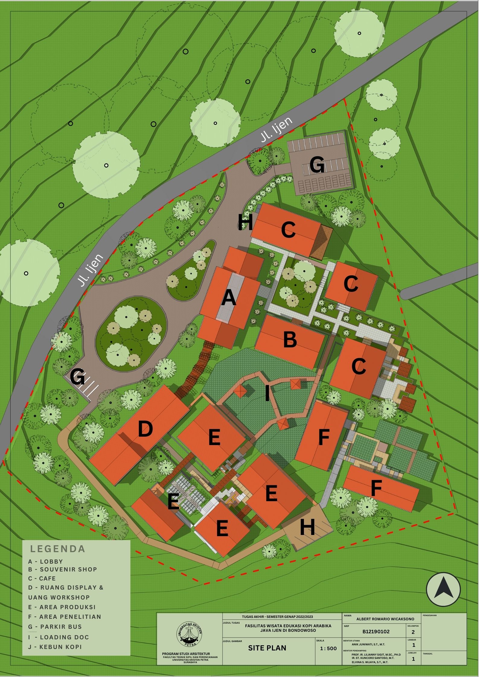 Library's collection Library's IT development CancelKota Bondowoso adalah daerah penghasil Kopi jenis Arabika Java Ijen. Dalam rangka pengembangan dan pengenalan jenis kopi ini, maka dibutuhkan adanya fasilitas yang dapat memberikan edukasi namun dikemas dalam bentuk wisata. di samping itu dimasukkan juga elemen alam ke dalam desainnya melihat adanya potensi view yang menarik dari site yang dipilih. Digunakan prinsip-prinsip perancangan perilaku dengan menggunakan teori privasi, dan ruang personal, serta teori persepsi sehingga dapat memberikan pengalaman edukasi dengan kesan terhubung alam. Pengunjung dapat merasakan secara langsung wisata alam melalui kebun kopi dan juga proses produksi biji kopi sehingga dapat memberikan pengalaman yang unik bagi pengunjung. Hal ini juga berdampak dalam perancangan penataan massa melalui zoning yang didapat dari analisa hubungan perilaku pengguna dengan program kegiatan.