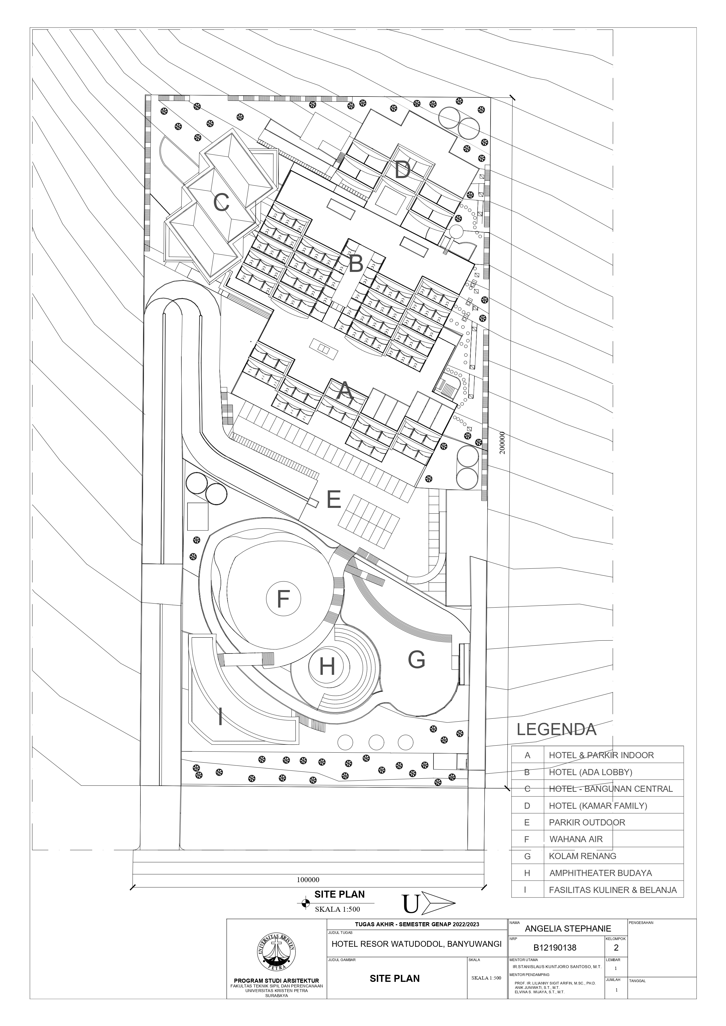 Library's collection Library's IT development CancelKabupaten Banyuwangi adalah daerah yang memiliki potensi wisata sangat besar dari budaya, adat istiadat, sejarah, kuliner, suaka, satwa hingga alamnya. Namun sayangnya, potensi wisata ini belum terolah secara maksimal yang menyebabkan pariwisata di Banyuwangi tidak seterkenal Bali, pulau yang berada tepat di seberangnya. Sesungguhnya pembangunan sektor wisata Banyuwangi sudah mendapat dukungan dari Pemerintah Daerah setempat, namun masih banyak faktor yang menghambat pengembangan pariwisata. Oleh karena itu, fasilitas wisata ini di desain sedemikian rupa untuk memberikan solusi terhadap beberapa hambatan tersebut. Sehingga dapat meningkatkan popularitas sektor pariwisata, ekonomi masyarakatnya dan rasa ingin melestarikan kekayaan daerah di Kabupaten Banyuwangi. Solusi desain diterapkan melalui pendekatan sistem pada pengolahan tapak dan kebutuhan dari jenis fasilitas. Pendekatan sistem bertujuan untuk memaksimalkan desain dari fasilitas terhadap kondisi dan potensi tapak yang berada di tanah berkontur curam. Penerapannya dalam bentuk penataan sirkulasi pada tapak dan desain bangunan yang bertrap, mengikuti bentuk kontur yang curam. Material yang paling banyak diterapkan pada desain adalah beton bertulang dan batu kali di mana beton bertulang sebagai material struktur utama bangunan sedangkan batu kali sebagai material yang diterapkan pada banyak tembok penahan tanah.