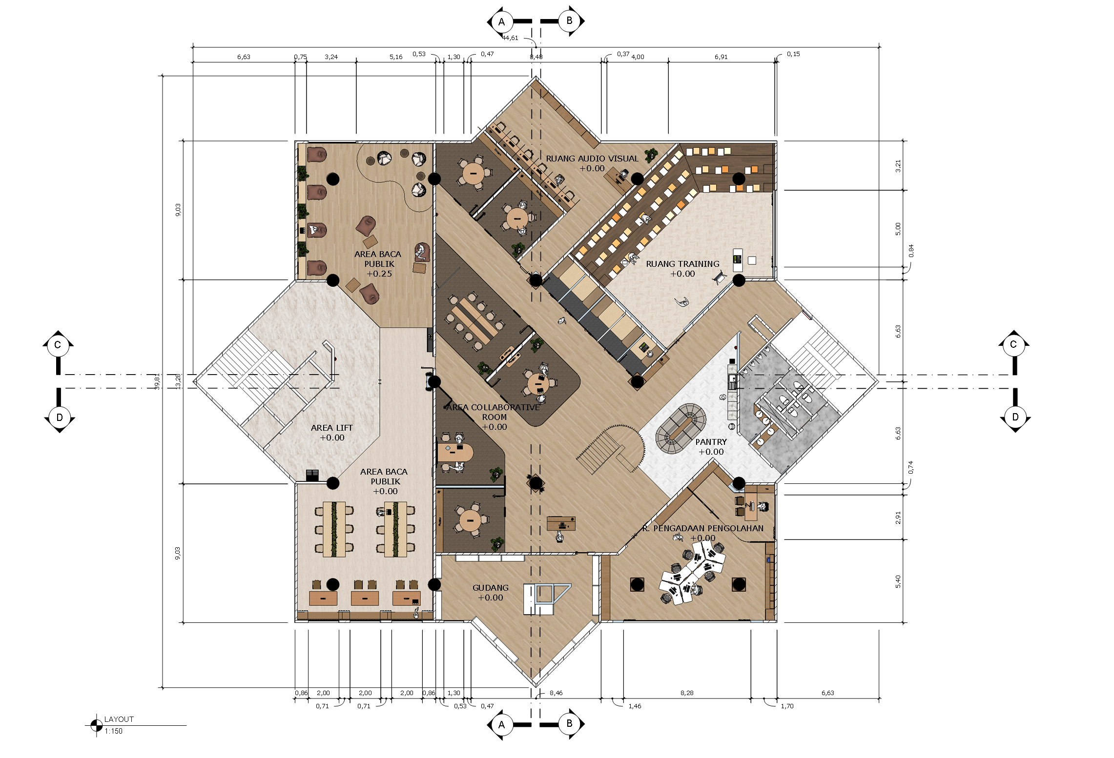 Library's collection Library's IT development CancelPerancangan interior yang bertanggung jawab secara ekologis dan mengakomodasi kegiatan penyimpanan buku, diskusi, membaca, pelatihan, serta pekerjaan menggunakan laptop dan komputer adalah kebutuhan yang perlu dipertimbangkan dalam renovasi lantai 5 Perpustakaan Universitas Kristen Petra. Eco-design menjadi pendekatan yang digunakan dalam merancang ulang interior dengan memanfaatkan bahan dan perabot bekas melalui upcycling. Solusi-solusi desain inovatif dan berkelanjutan akan mengoptimalkan penggunaan ruang, meningkatkan keamanan buku, menciptakan ruang kerja yang nyaman, dan mengurangi dampak negatif terhadap lingkungan. Metode perancangan menggunakan 6 tahap design thinking yaitu understand, observe, point of view, ideate, prototype dan test. Lantai 5 perpustakaan Universitas Kristen Petra direncanakan untuk direnovasi dengan penambahan ruang baca publik, ruang kolaboratif privat yang dapat dipesan, ruang training yang dilengkapi fasilitas yang memadai, serta perluasan area gudang. Rancangan ulang interior ini menerapkan eco-design dengan menggunakan material sisa yang diolah kembali menjadi perabot.