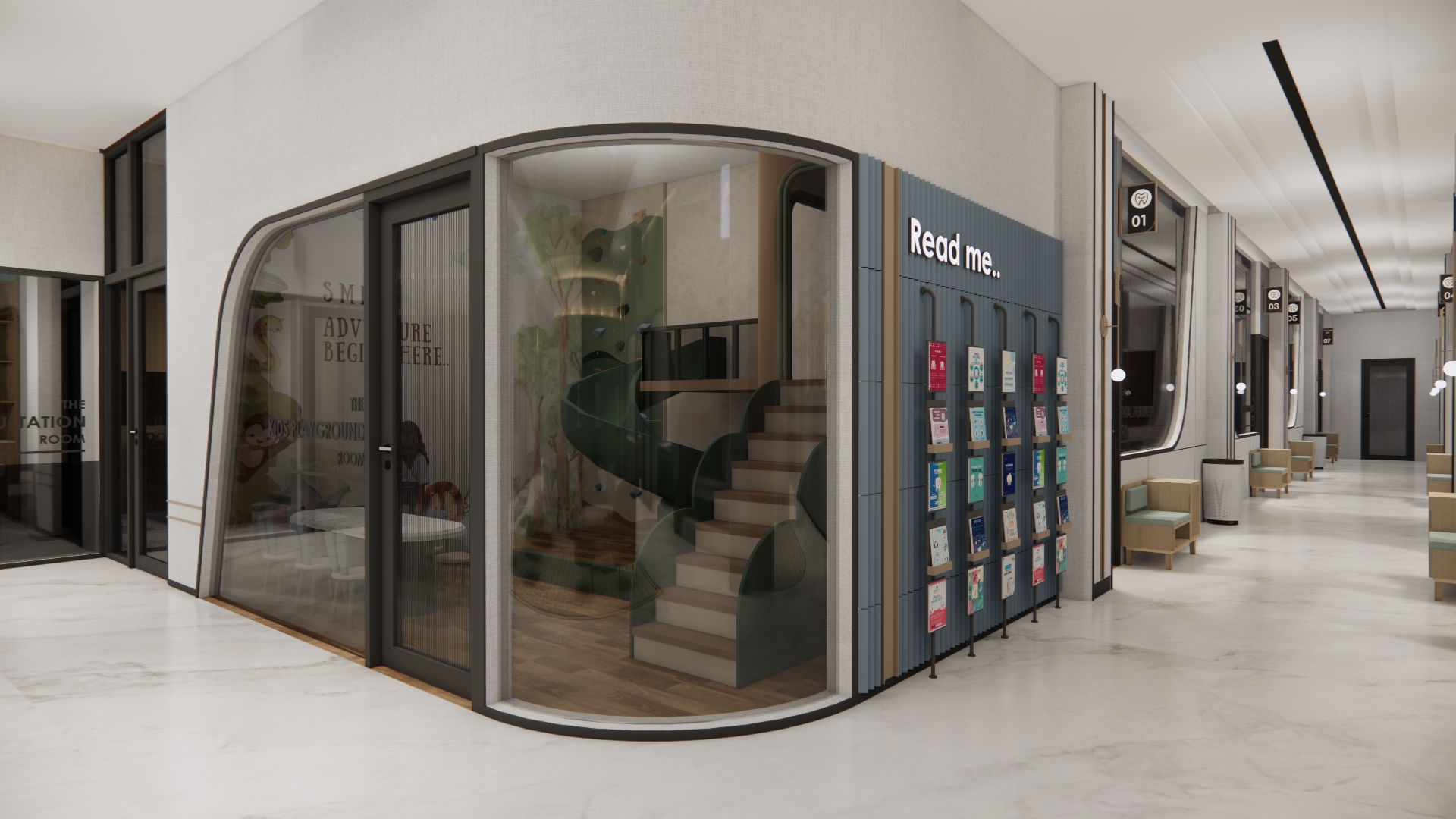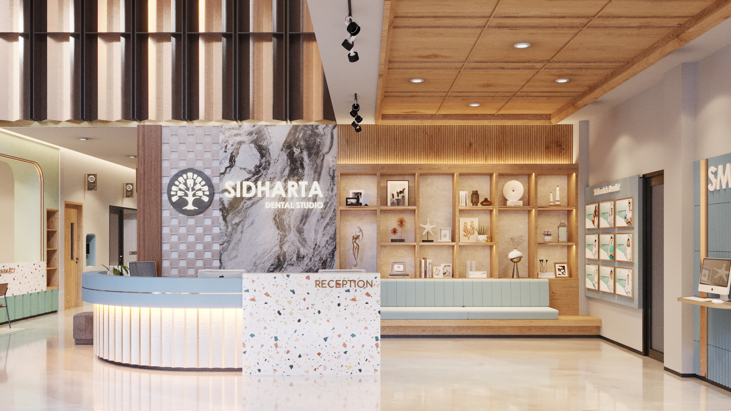 Library's collection Library's IT development CancelPerancangan Interior Sidharta Dental Clinic di Malang merupakan pusat perawatan kesehatan gigi yang melayani 7 spesialisasi perawatan gigi. Tujuan dari perancangan klinik gigi Sidharta adalah klinik yang dapat memberikan rasa nyaman kepada pasien melalui pengalaman klinik yang menyenangkan dengan tersedianya fasilitas yang sesuai dengan kebutuhan pengguna, yang terdiri dari fasilitas utama klinik (ruang tindakan, laboratorium, sterilisasi, konsultasi, resepsionis), fasilitas edukatif (penyediaan teknologi digital, area baca) dan fasilitas rekreatif (area bermain anak, customer lounge, indoor dan outdoor garden) dan fasilitas tambahan (apotek dan ruang rontgen). Konsep perancangan “SMILE” yang diimplementasikan dengan pendekatan healing environment. Metode perancangan yang digunakan adalah design thinking yang terdisi dari tahap inspirasi, ideasi dan implementasi.