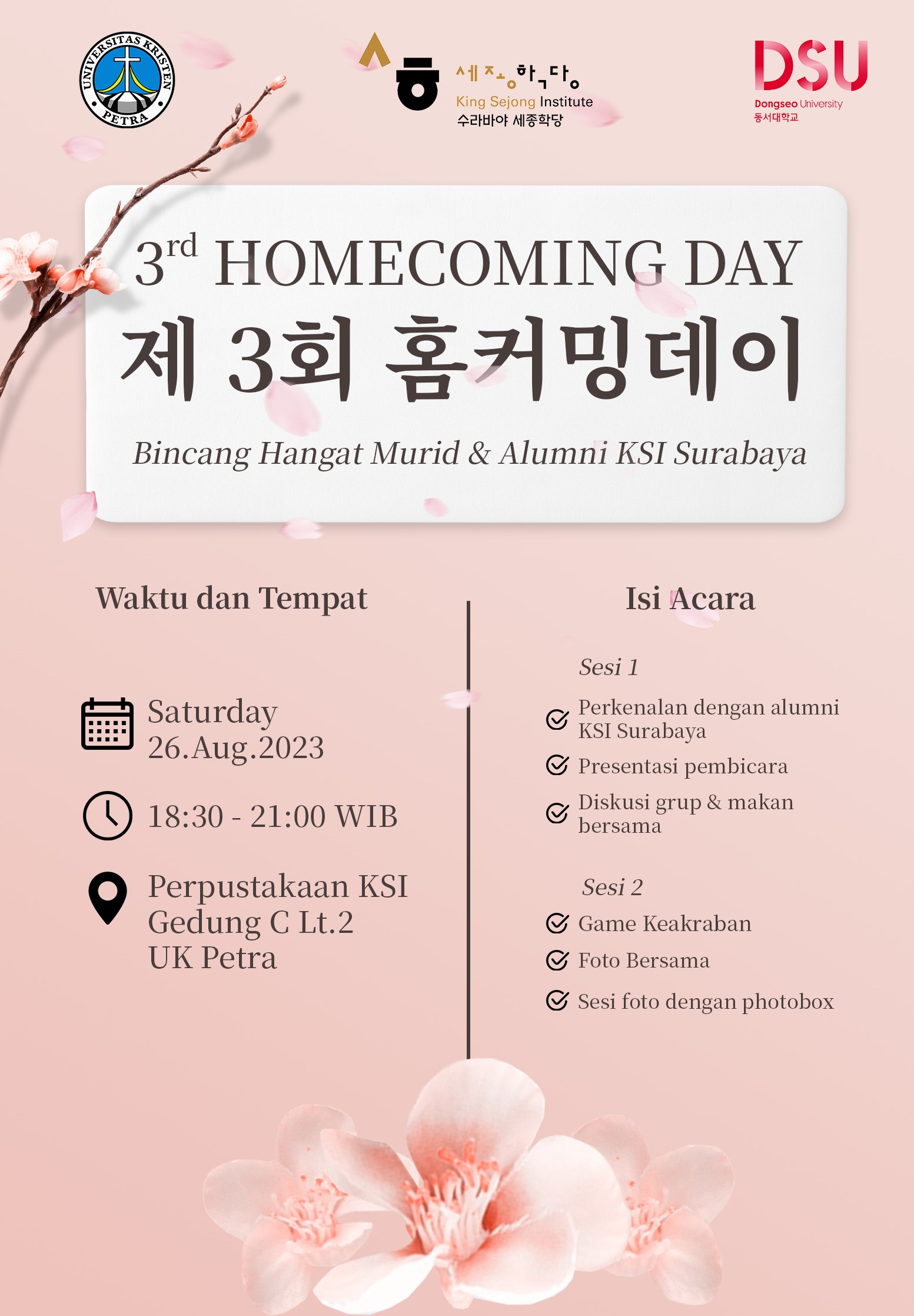 Library's collection Library's IT development CancelAcara Homecoming Day Ketiga merupakan salah satu program peningkatan jaringan murid yang diadakan oleh KSI Surabaya. Dalam acara ini akan ada dua sesi. Sesi pertama akan diisi oleh perkenalan dengan alumni KSI Surabaya, presentasi pembicara serta diskusi grup sembari makan malam. Kemudian pada sesi kedua akan ada games keakraban, foto bersama serta sesi foto dengan photobox yang sudah disediakan.Tujuan dari acara 3rd Homecoming Day ini adalah agar murid dan alumni KSI Surabaya dapat saling mengenal dan berbagi informasi tentang bagaimana perjalanan belajar Bahasa dan Budaya Korea di KSI Surabaya hingga dapat bermanfaat bagi kehidupan mereka. Dilaksanakan pada Sabtu, 26 Agustus 2023 bertempat di Perpustakaan KSI gedung C lantai 2 Universitas Kristen Petra Surabaya.